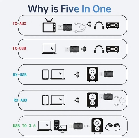 • 5 em 1 :Este adaptador sem fio pode ser usado como receptor, transmissor, placa de som e reprodutor de música, tudo em um único dispositivo.