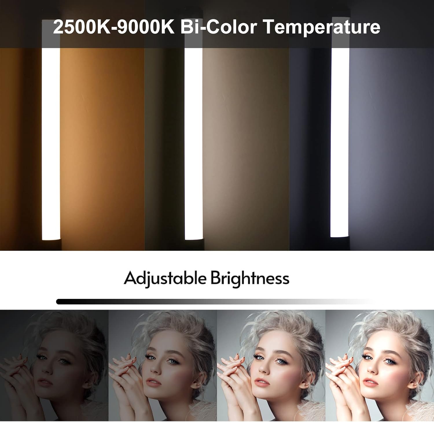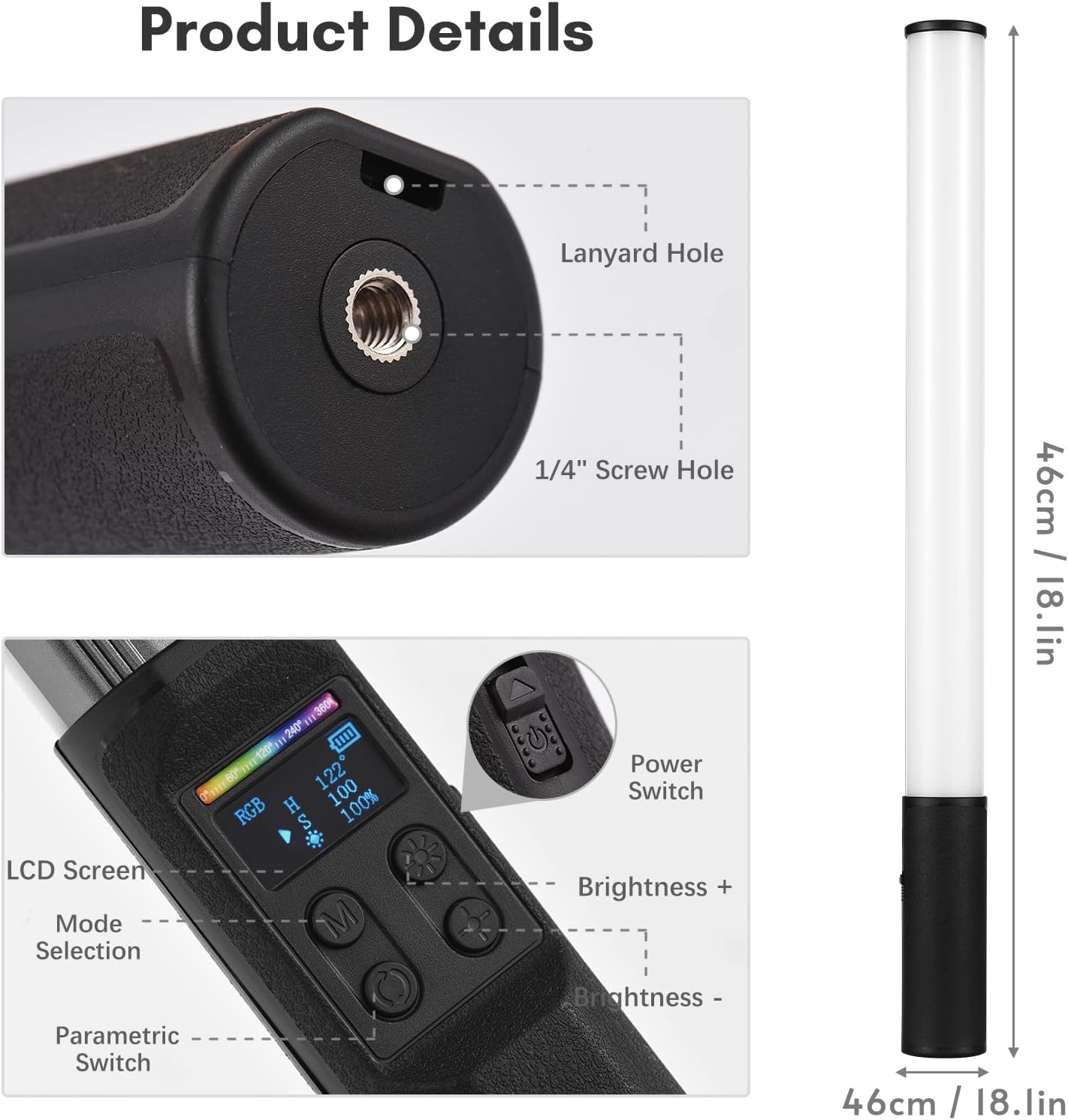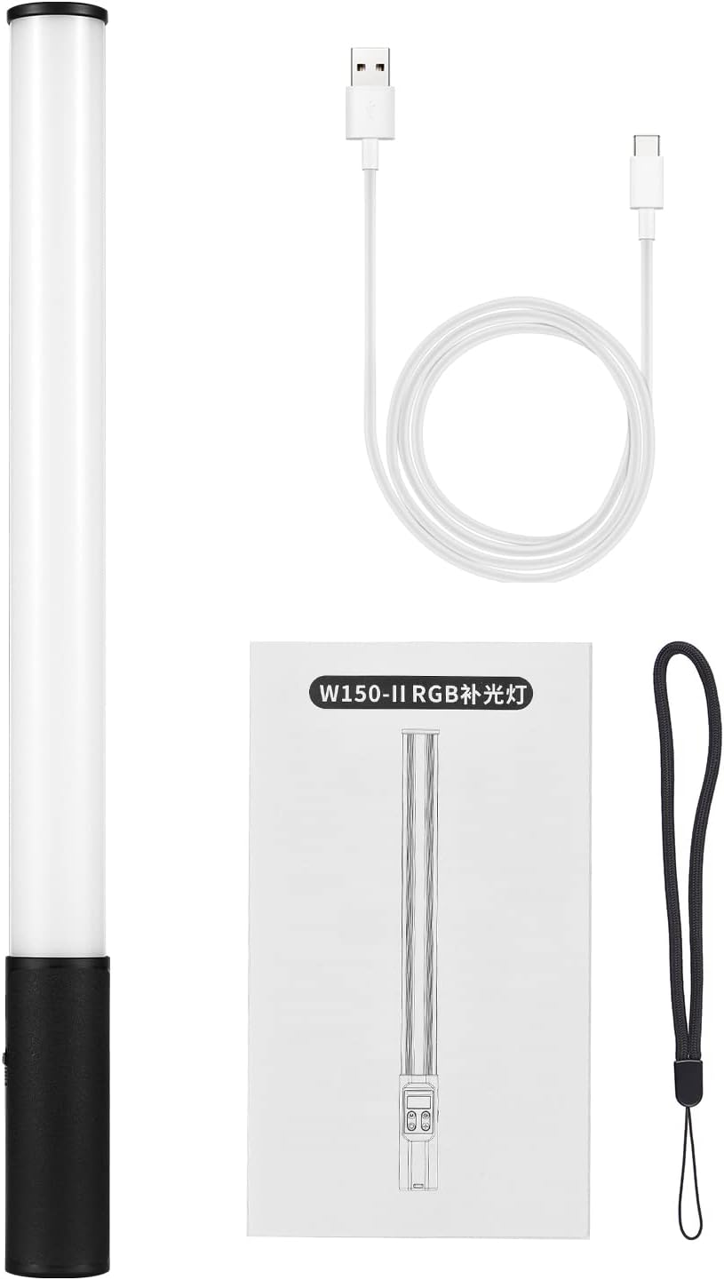 Adotando 150 LED de alto índice de reprodução de cores, nossa luz de vara portátil apresenta um ângulo de iluminação de até 120° e a brilhância pode alcançar 708LUX/0,3M CRI de alta qualidade 95+ significa que pode iluminar a cor mais próxima à da luz solar e garantir que sua luz seja naturalmente realista Temperatura de cor de 2500K (quente) a 9000K (frio) com dimmer. E 20 efeitos de luz se adaptam a diferentes cenas Com uma bateria recarregável de 2600mAh integrada, a vara de luz RGB pode ser usada continuamente por 70 minutos na potência máxima Equipado com uma porta de carregamento Type-C, basta carregar com o cabo (incluído no pacote) e 2 horas para uma carga completa Com um design humanizado, este tubo de luz é leve, pesando 253g/0,56 lb, e não cansará quando segurado por muito tempo Possui uma interface padrão ¼ especialmente projetada, o que é conveniente para equipamentos auxiliares de câmera fotográfica externa para obter melhores efeitos de iluminação Especificações: