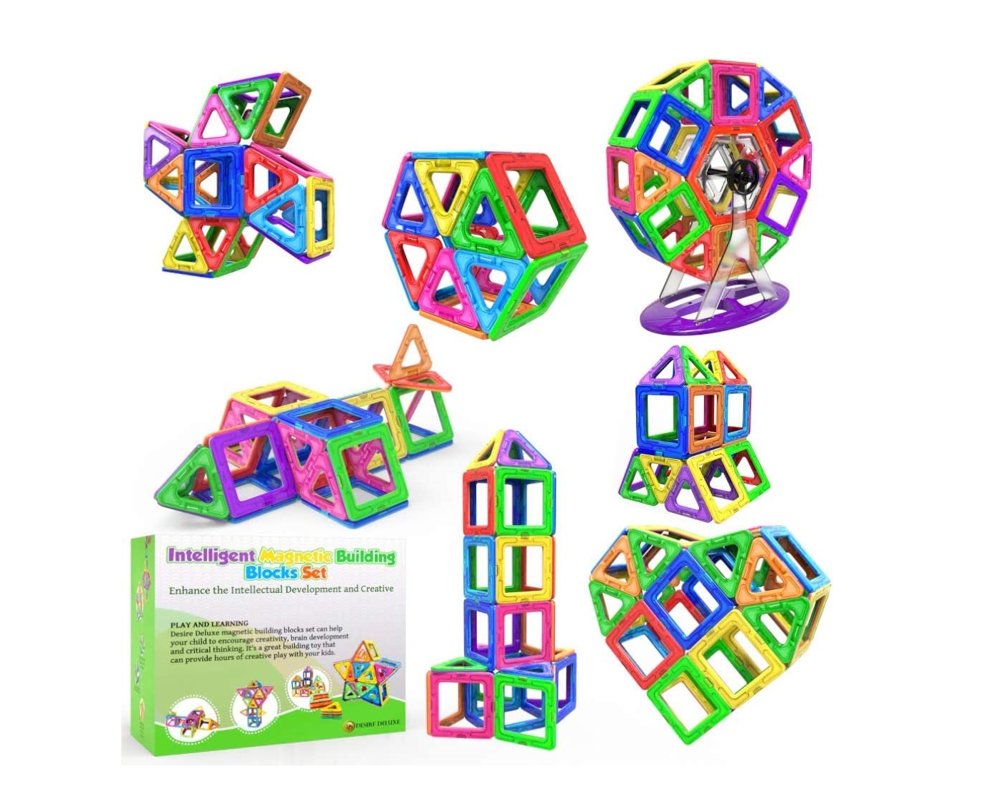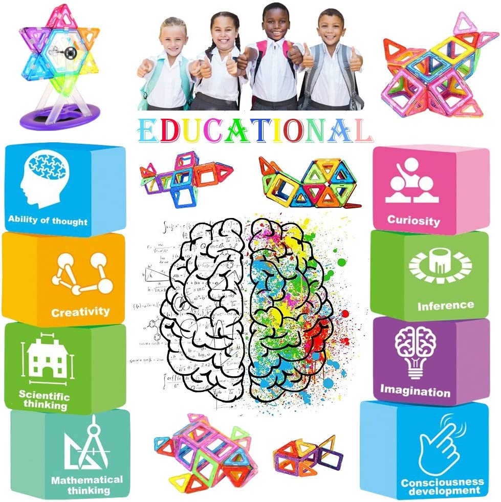 Vários modelos de brinquedos magnéticos – As crianças podem criar formas 2D ou estruturas geométricas 3D; combinando os blocos magnéticos conseguirão criar diferentes desenhos, como cabras, casas, pentagramas, formas de coração, moinhos de vento, aviões, bolas e o que mais lhes ocorrer.