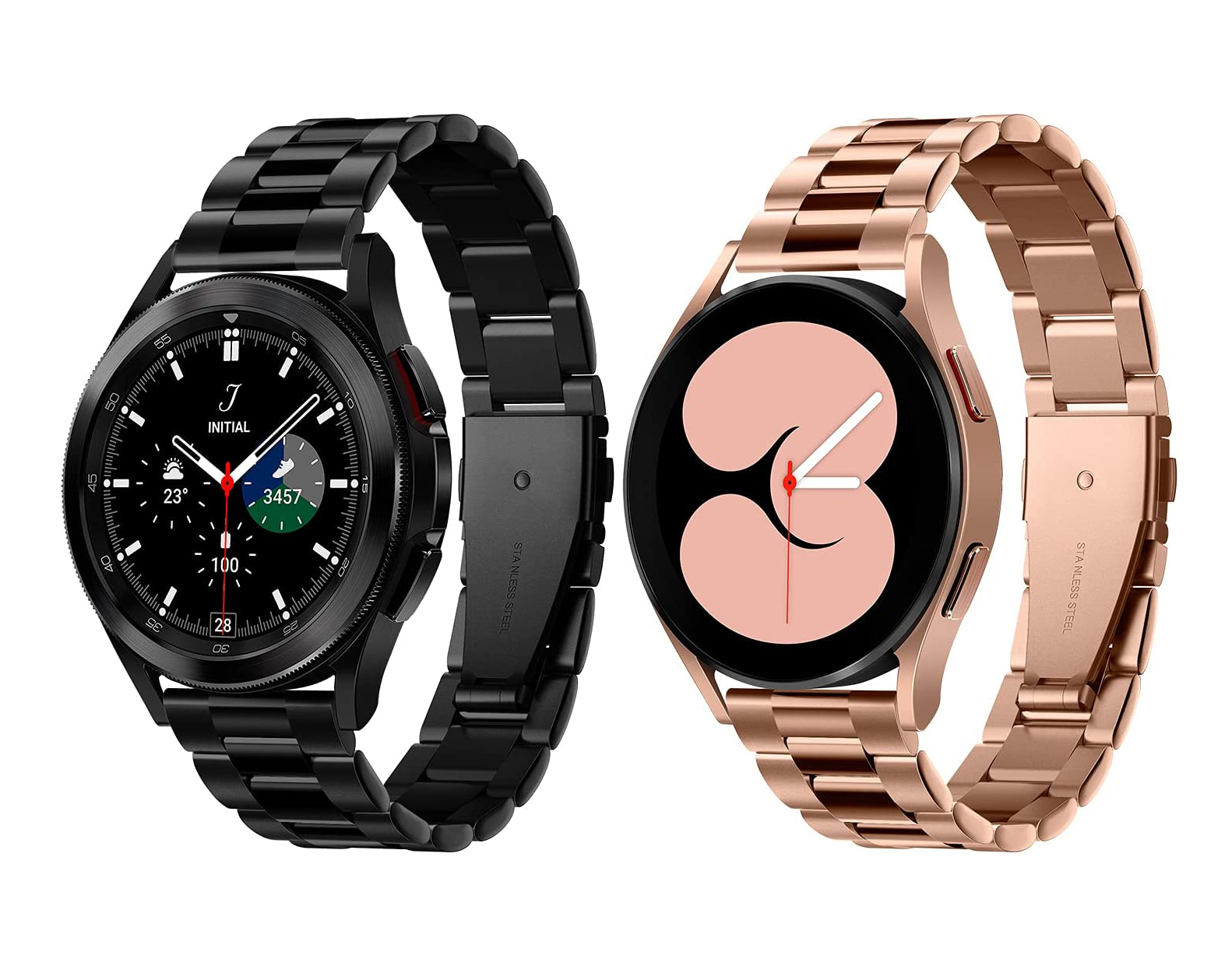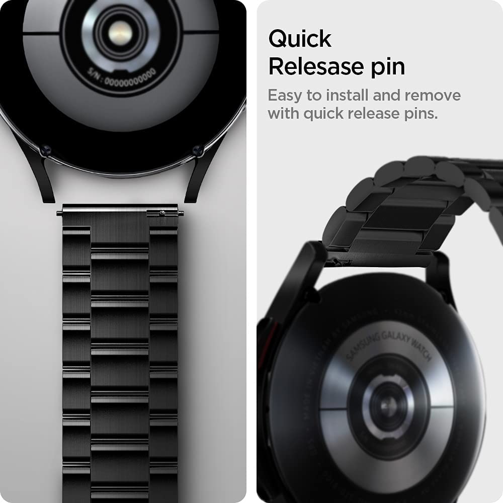 Feito com precisão para o Galaxy Watch Tiras de aço inoxidável sólidas para ótima durabilidade O design elegante traz uma aparência distinta ao relógio Ajuste facilmente as faixas com o kit de ferramentas incluído Fecho de metal fornece fechamento rápido e seguro