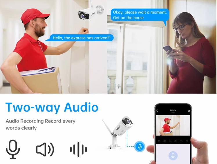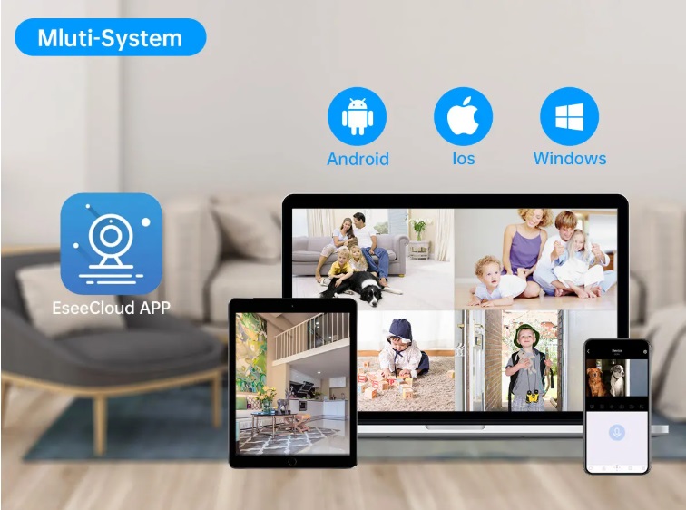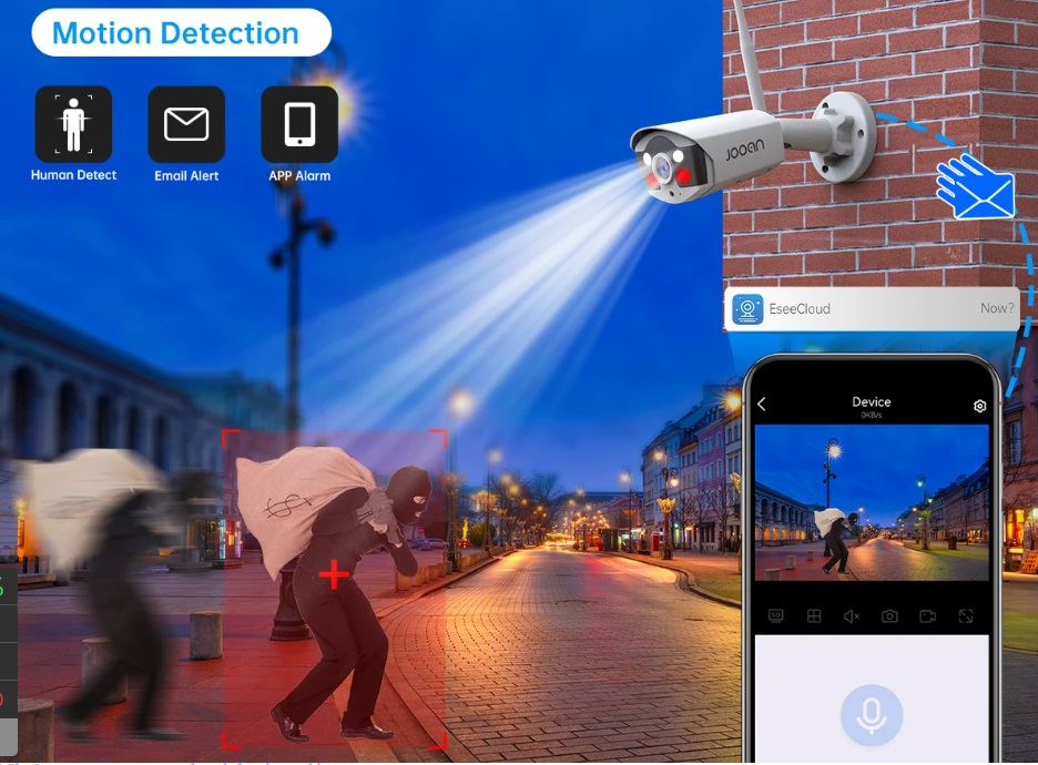 Câmara de vigilância 3MP (1440P) com lente 3.6 mm, visão nocturna, áudio bidirecional e proteção IP66 para uso interior ou exterior. Suporta deteção de humanos com alertas via app e e-mail, três modos de visão nocturna (cor, infravermelho e cor inteligente) e armazenamento em HDD (500 GB–6 TB) ou na nuvem. Compatível com a aplicação EseeCloud (iOS/Android/PC) e acesso remoto P2P.