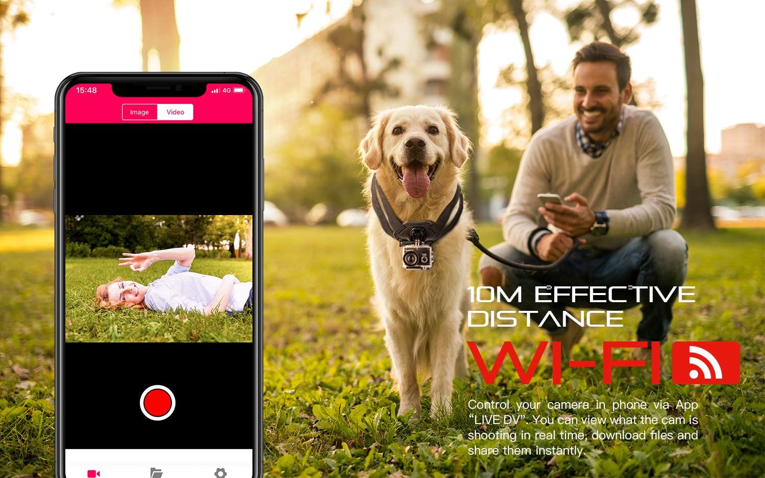 Comando e WiFi: com controlo remoto para que possa controlar a câmara remotamente a uma distância de até 10 metros sem precisar de a segurar por longos períodos. O botão vermelho tira fotos e o botão cinzento grava vídeos. Através da função WiFi pode controlar a câmara com o seu telemóvel ou tablet, e inclusive até pode alterar as configurações, tirar fotos, gravar vídeos e descarregar ficheiros partilhados instantaneamente.