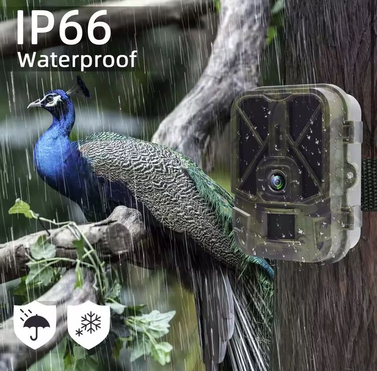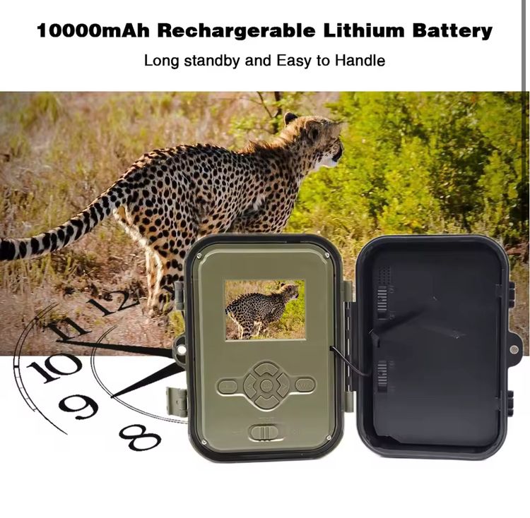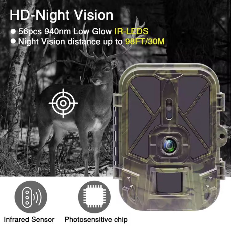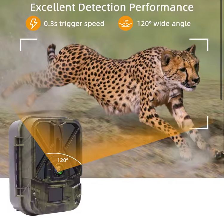 Câmara de caça com fotos de até 50 MP e vídeo 4K com som, equipada com sensor de grande ângulo de 120°. Possui velocidade de disparo rápida de 0,3 s, modo multi-shot (3/6/9 fotos) e autonomia até 8 meses com 10 pilhas AA. Os 3 sensores PIR permitem deteção até 25 m, e os LEDs infravermelhos de 940 nm garantem visão noturna sem assustar animais.