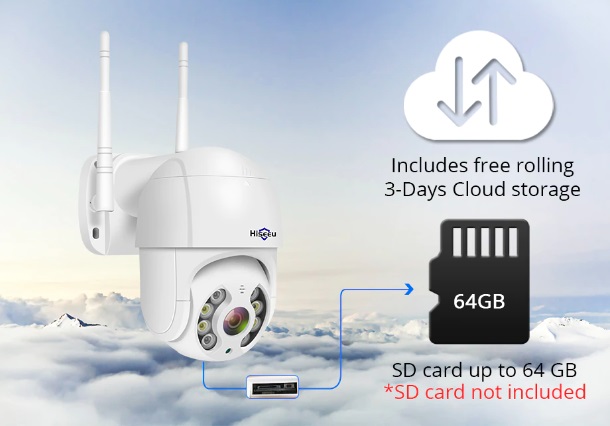 Gravação de imagens em cloud ou em cartão micro SD (suporta até 64GB).