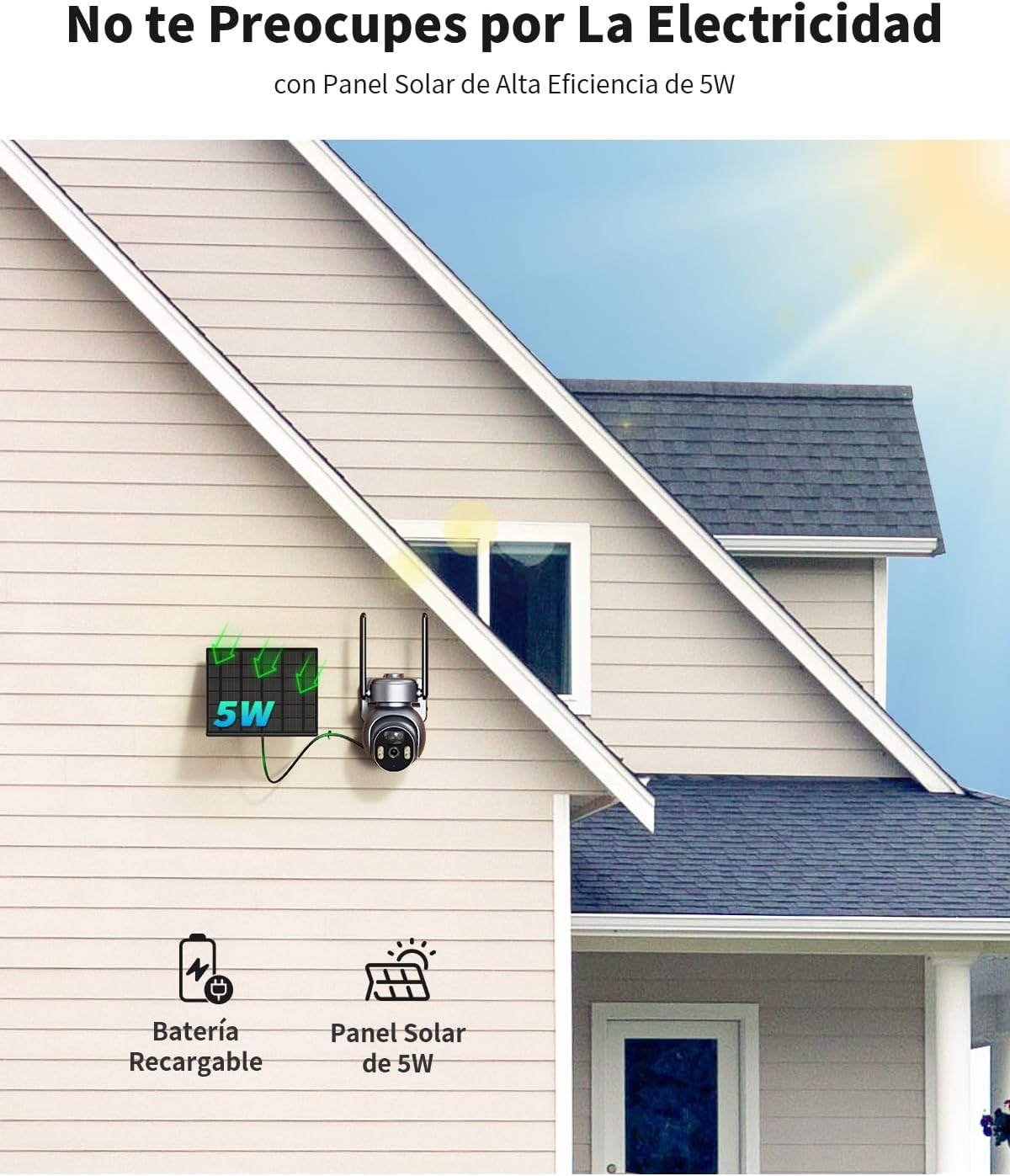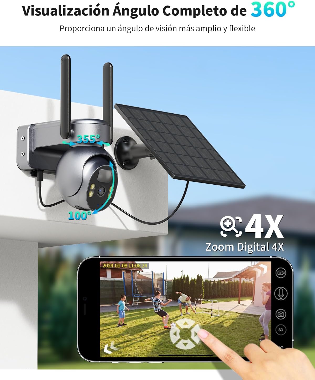 Câmara de segurança 4G LTE que funciona sem Wi-Fi e sem necessidade de ligação elétrica, ideal para locais remotos. Oferece vídeo 2K Ultra HD, visão de 360° e zoom digital 4x. É alimentada por energia solar para funcionamento contínuo e instalação totalmente sem fios.