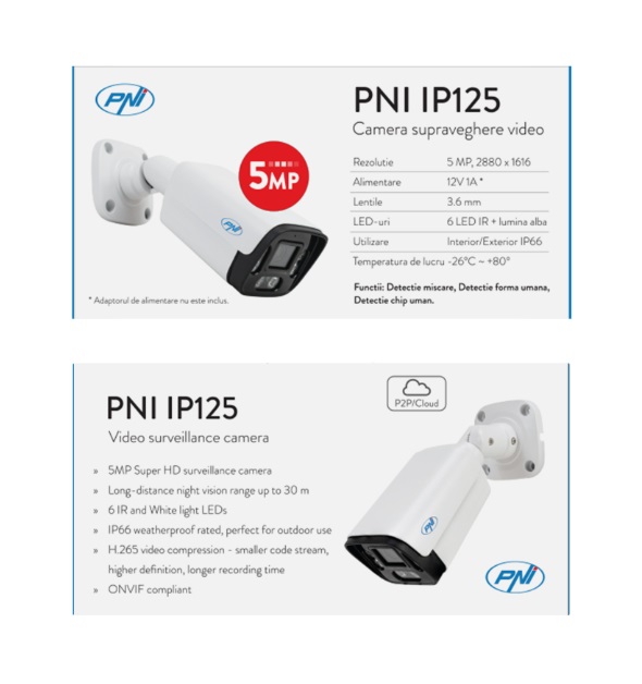 Suporta até 16 câmaras IP 4K. Compressão de vídeo H.265 para maior eficiência de armazenamento. Fácil configuração e acesso remoto através de aplicativo, PC ou navegador. Suporta gravação manual, de alarme, de movimento ou programada. Compatível com disco rígido de até 14 TB. Câmara PNI IP125: