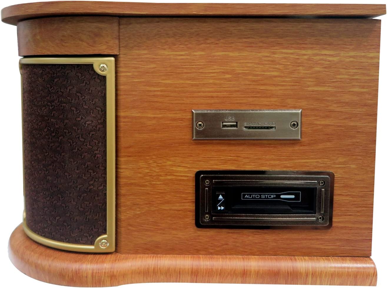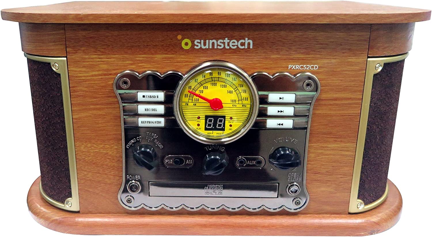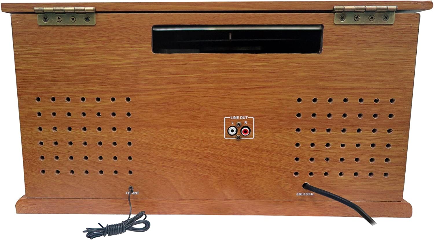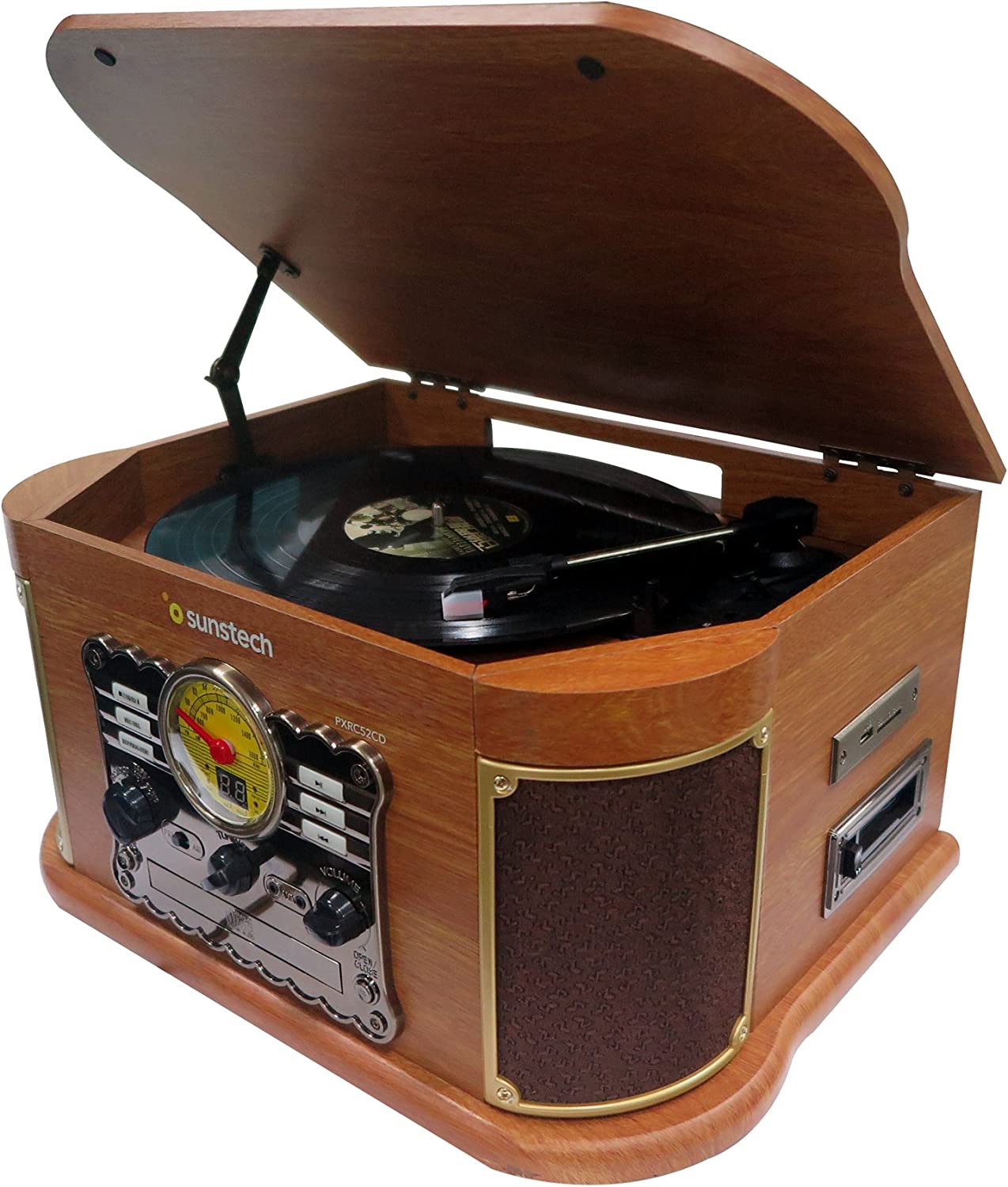 Gira-discos de madeira com 3 velocidades (33, 45 e 78 rpm), bluetooth e 2 colunas 2,5W RMS, Leitor de CD, mp3, placa para cassete e sintonizador analógico AM e FM estéreo, Porta USB, leitor de cartões sd e mmc, aux-in, ligação de auriculares, ligação rca (saída de áudio para amplificadores externos) e controlo de volume, Gravação direta (giradiscos / cd / aux a usb / sd / mmc), função encoding (converte músicas para o formato digital mp3) e função de separação (separar músicas mp3) Funções de repetição, programação e auto-stop (paragem automática de giradiscos, botão em / off) Nome do modelo: PXRC52CDWD Formato do sinal: Digital