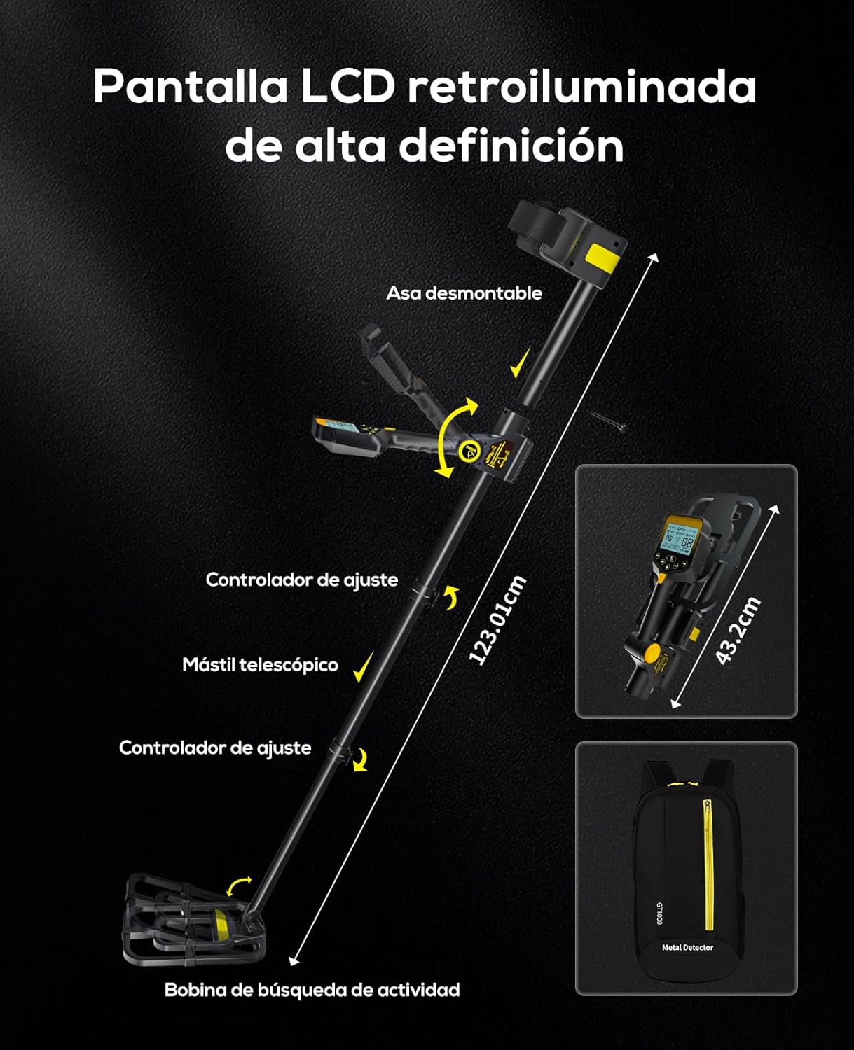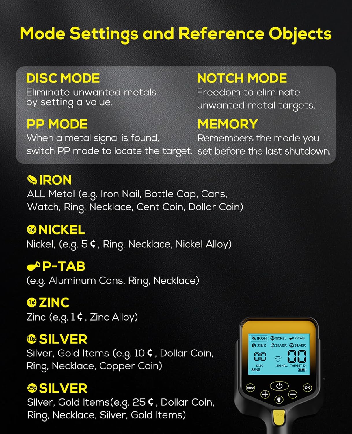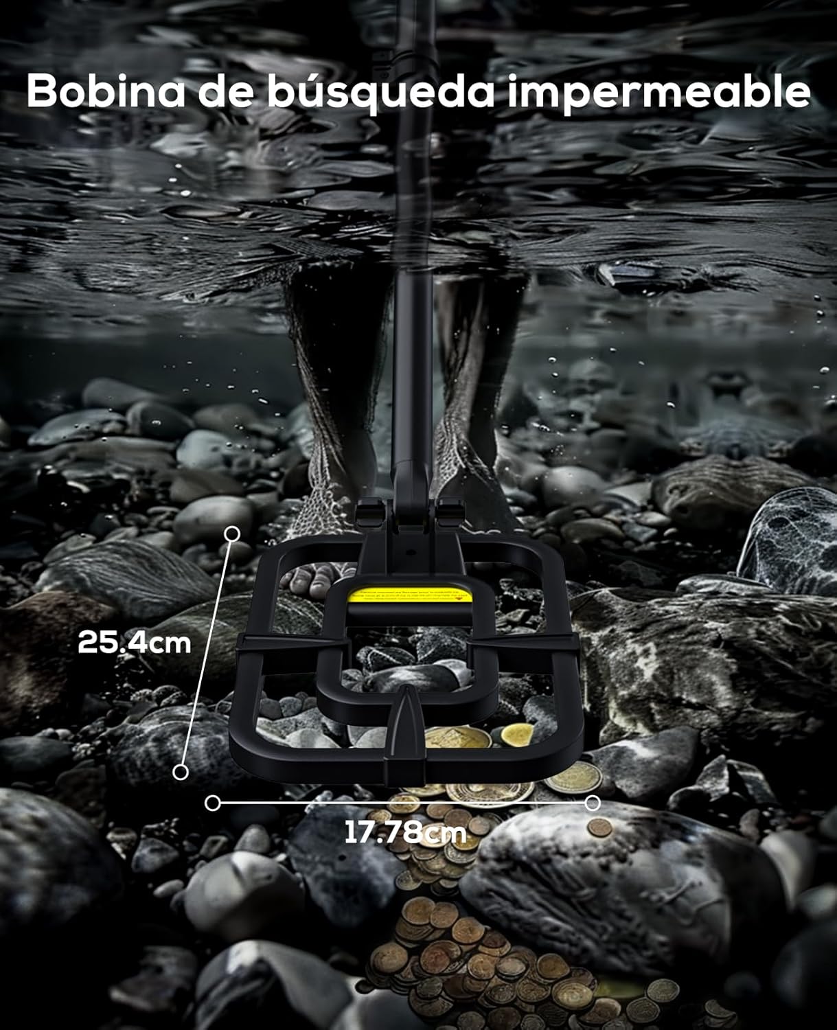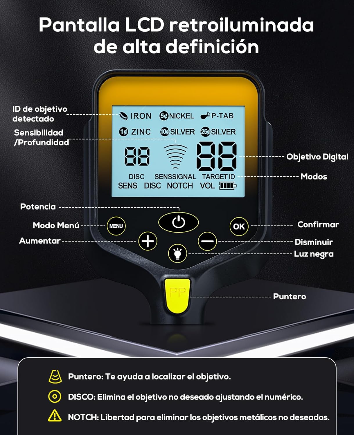 Todos os Metais DISC (discriminação de metais) Notch (bloqueio de metais indesejados) P/P (localização precisa do alvo) Sensibilidade e volume ajustáveis. ✔ Altura Ajustável – Regulável de 26,8” a 50”, adequado para adultos e crianças. ✔ Bobina Impermeável 10" x 7" (IP68) – Permite utilização em águas rasas. (Controlador não é impermeável). ✔ Inclui Acessórios – Pá, auriculares, cabo de carregamento e mochila.