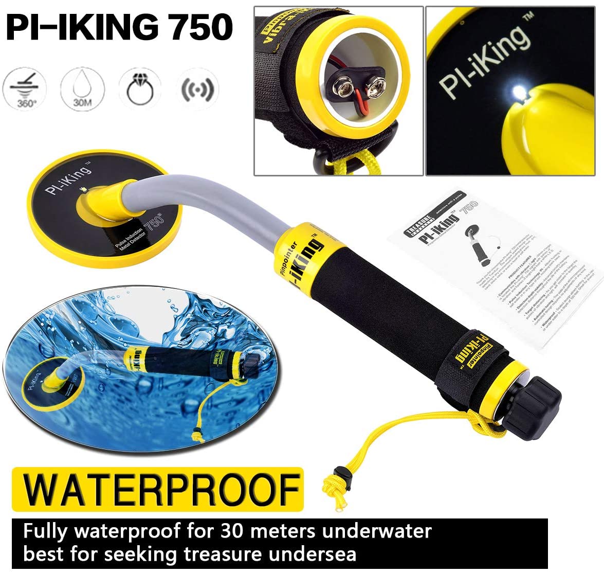 Detetor de metais submersível, detetável até 30 m debaixo de água, indução de pulso PI, regulação automática, totalmente impermeável, indicador de vibração e iluminação LED.