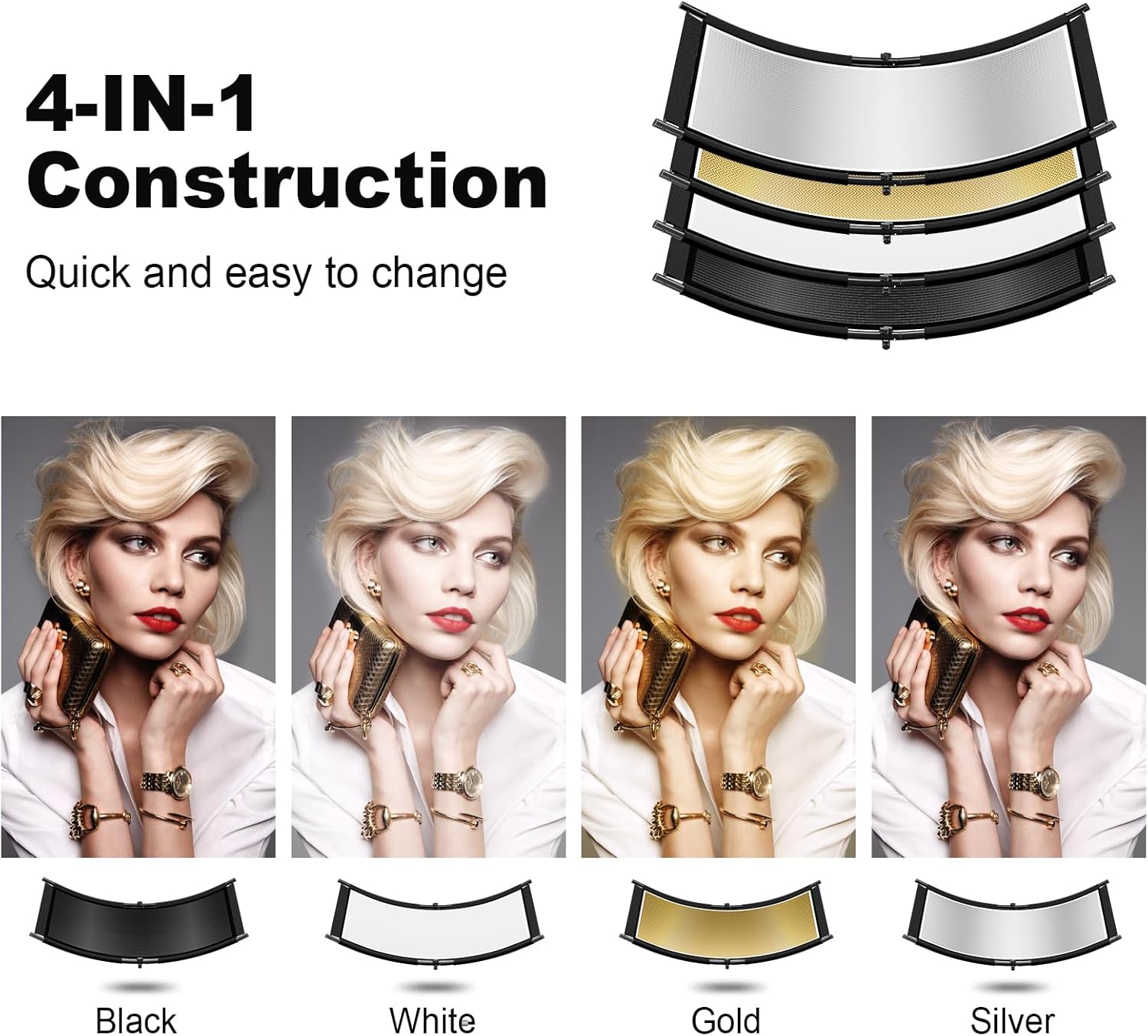 Este refletor é frente e verso com 4 cores (preto, branco, prateado, dourado) para 4 efeitos visuais, o refletor pode concentrar diferentes reflexos nos olhos, tornando-o mais charmoso e atraente.