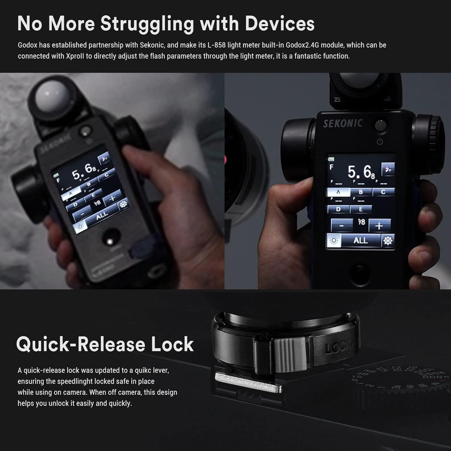 Trabalhar com medidor de luz: Depois de medir através do medidor de luz Sekonic L-858 com o módulo Godox 2.4G incorporado, pode definir diretamente o valor do flash no medidor de luz L-858. Com a forte ligação da Godox com a Sekonic, é direto para ajustar o valor do flash através do medidor de luz. Para este recurso, pode economizar mais tempo fotografando as suas imagens satisfeitas em vez de lutar com os dispositivos.