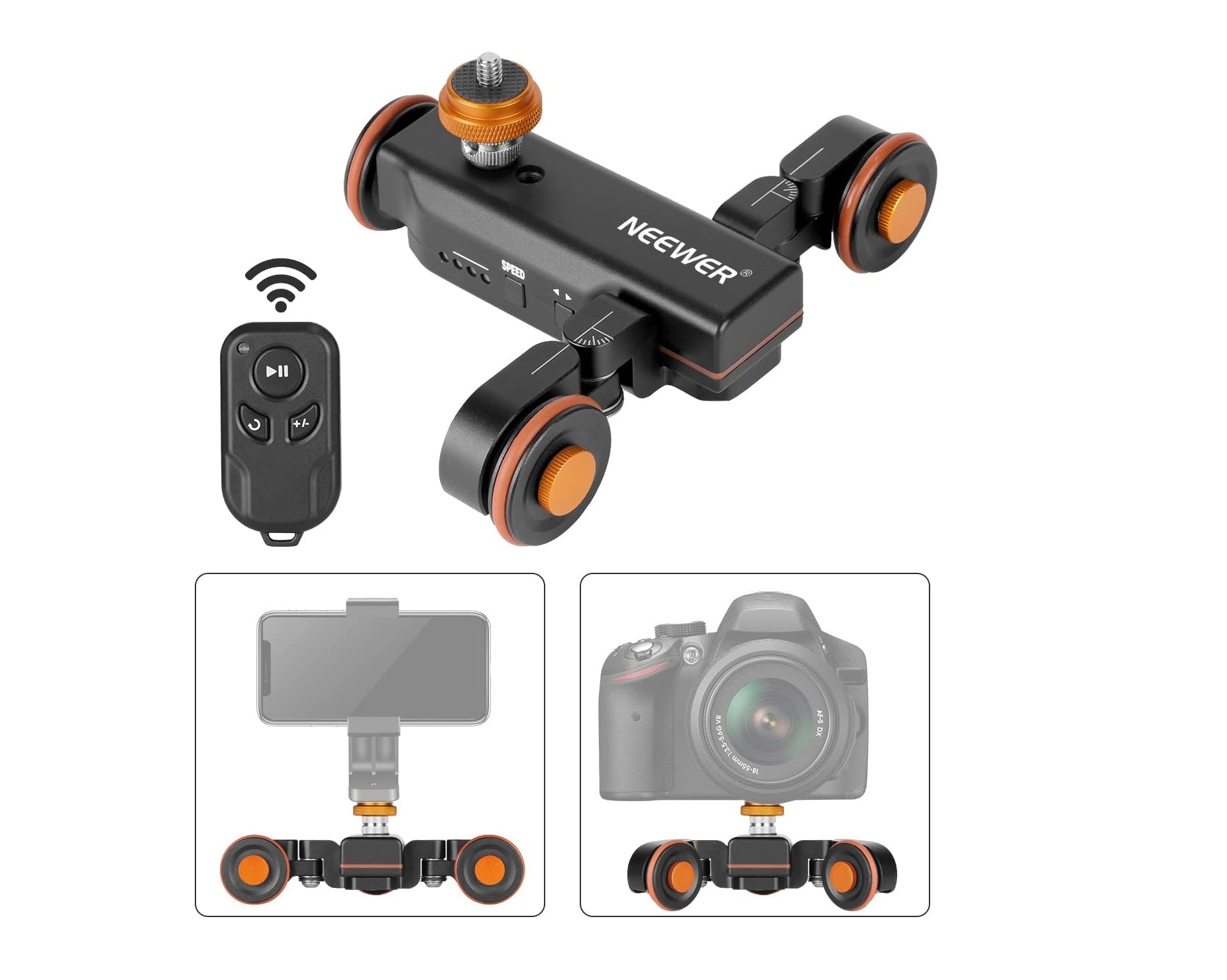 - O comando pode alterar a velocidade, direção e parar. - 3 velocidades ajustáveis (1,4 cm (s 2,4 cm/s 3,0 cm/s). - O ângulo da roda é ajustável a 180°, pode conseguir um movimento criativo na linha de círculo/linha. - O ajuste do parafuso central pode alterar a posição oposta das duas estruturas das rodas. - Parafuso conversível de 1/4" a 3/8" é adequado para a maioria dos suportes de câmaras / smartphones. - Bateria incorporada de 1500 mAh com autonomia até 6h e carregamento por USB - Com indicador de bateria