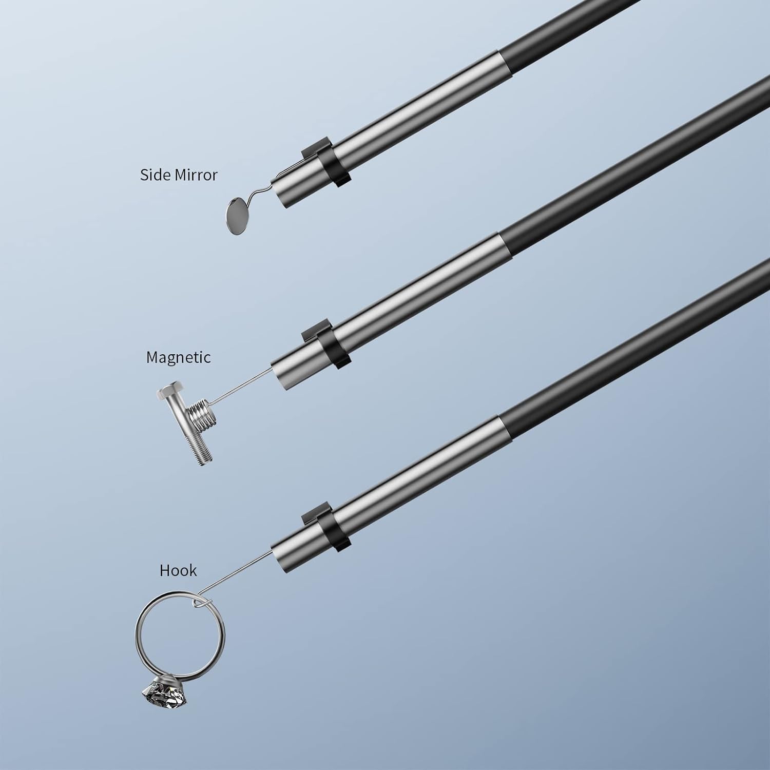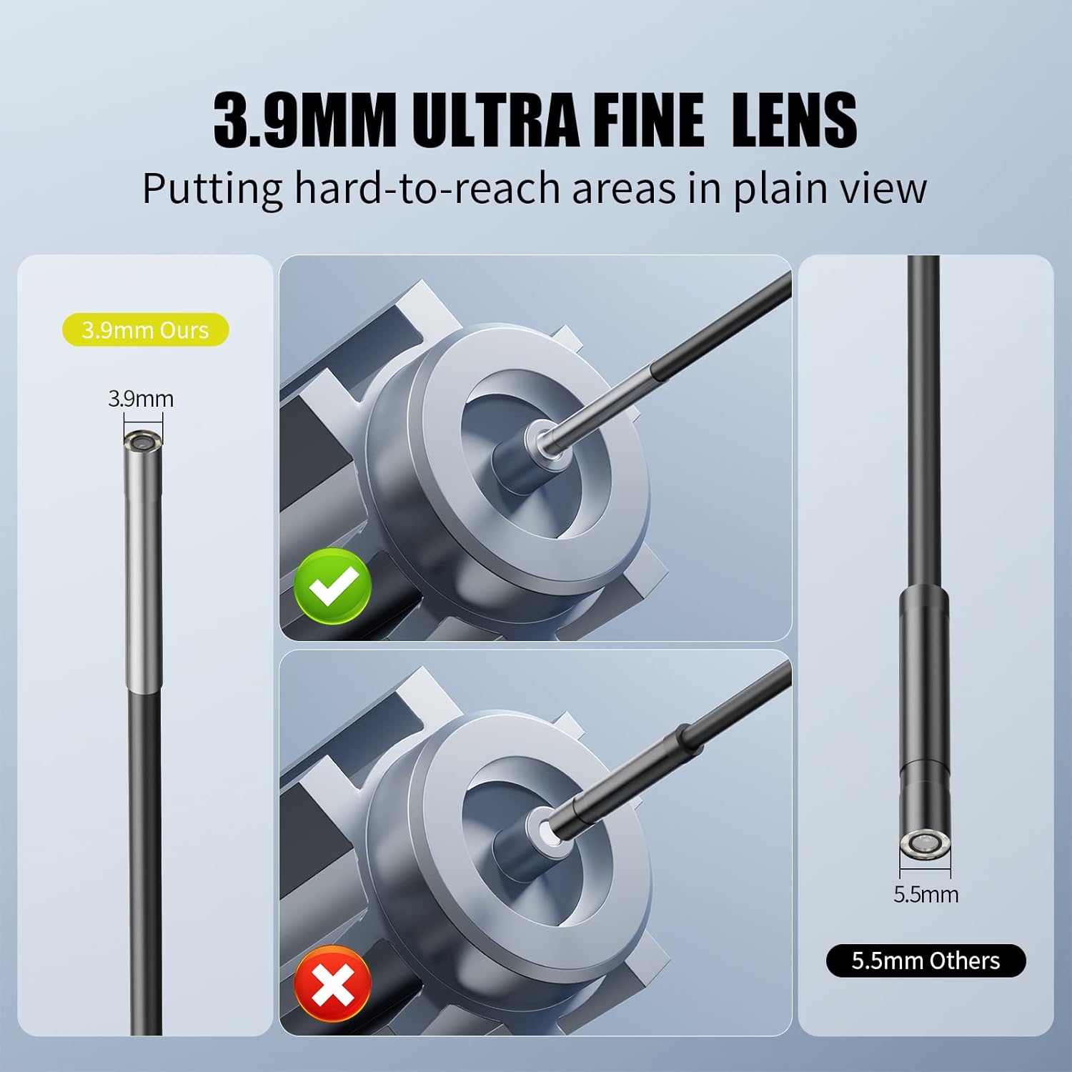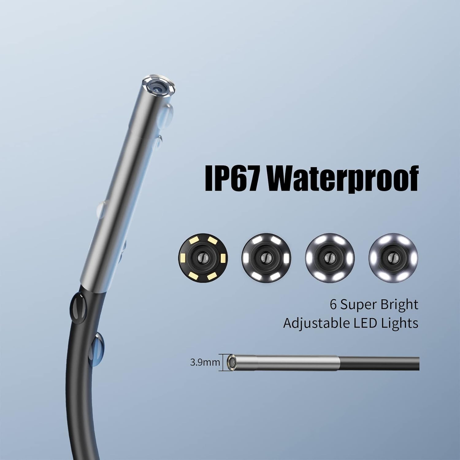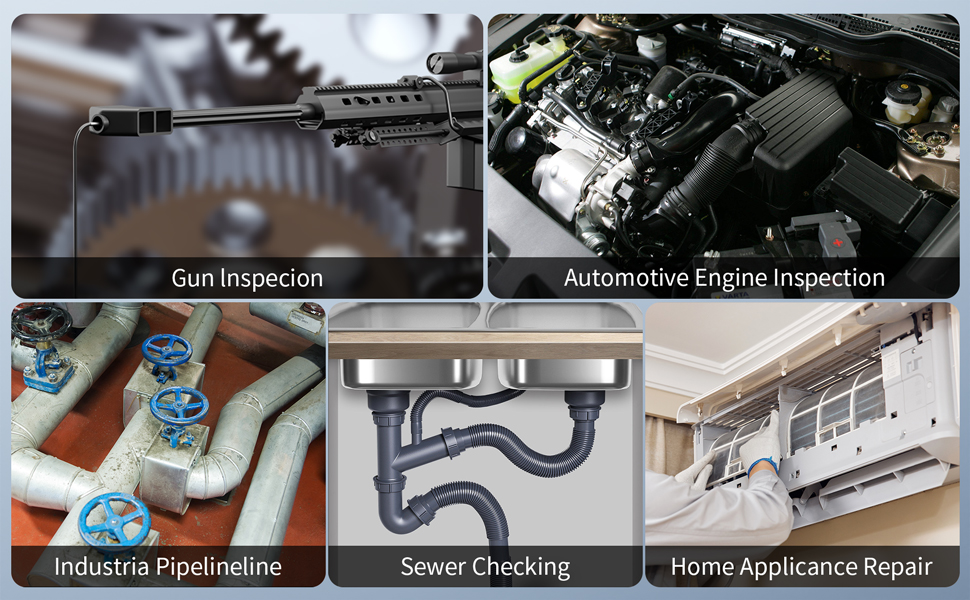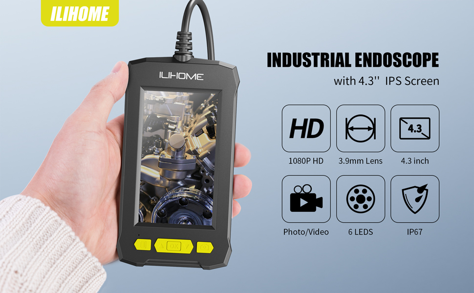 Sonda ultrafina de 3,9 mm. Fina o suficiente para aceder a locais mais estreitos. Vem com um cabo de 5 m semi rígido que se dobra facilmente e mantém a sua forma para entrar numa ampla variedade de locais estreitos. Ecrã IPS HD 1080P de 4,3 polegadas IPS e possui uma resolução mais alta, cores mais realistas e imagens mais nítidas de vários ângulos. 6 LEDs ajustáveis para iluminação. Impermeabilidade IP67 à prova de água e pode funcionar debaixo de água mais de 1 hora. Bateria recarregável integrada de 3000 mAh com autonomia de uso contínuo de 3 a 4 horas. Sem necessidade de ligar a dispositivos móveis nem instalar apps. Usado para visualização ou para gravação de imagens para cartão de memória até 32GB (não incluído) Utilizado em campos como inspeção de automóveis, manutenção mecânica, inspeção de eletrodomésticos, manutenção de casas, inspeção de estruturas de parede, etc.