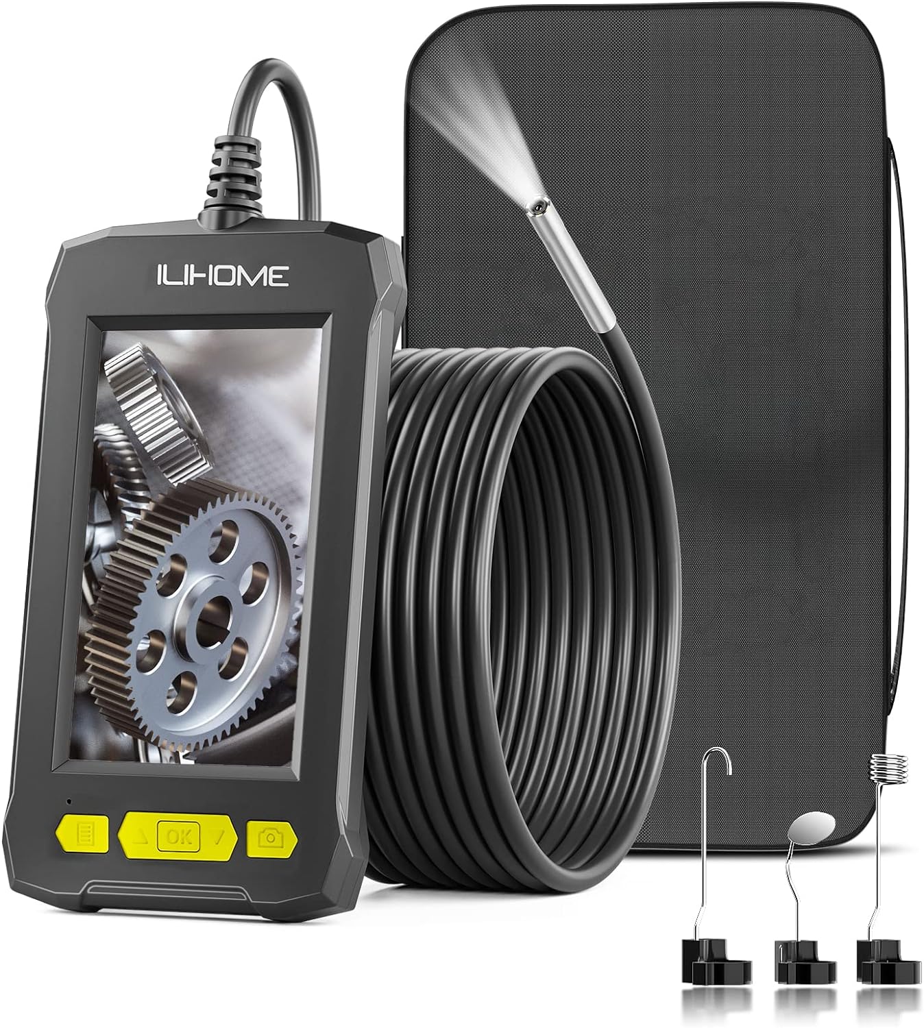 Incluído: 1 câmara endoscópica IPS de 4,3" , 1 cabo semirígido de 5 m, 1 cabo micro USB, 1 conjunto de acessórios (gancho, íman e espelho lateral), 1 manual do utilizador, 1 estojo de viagem .