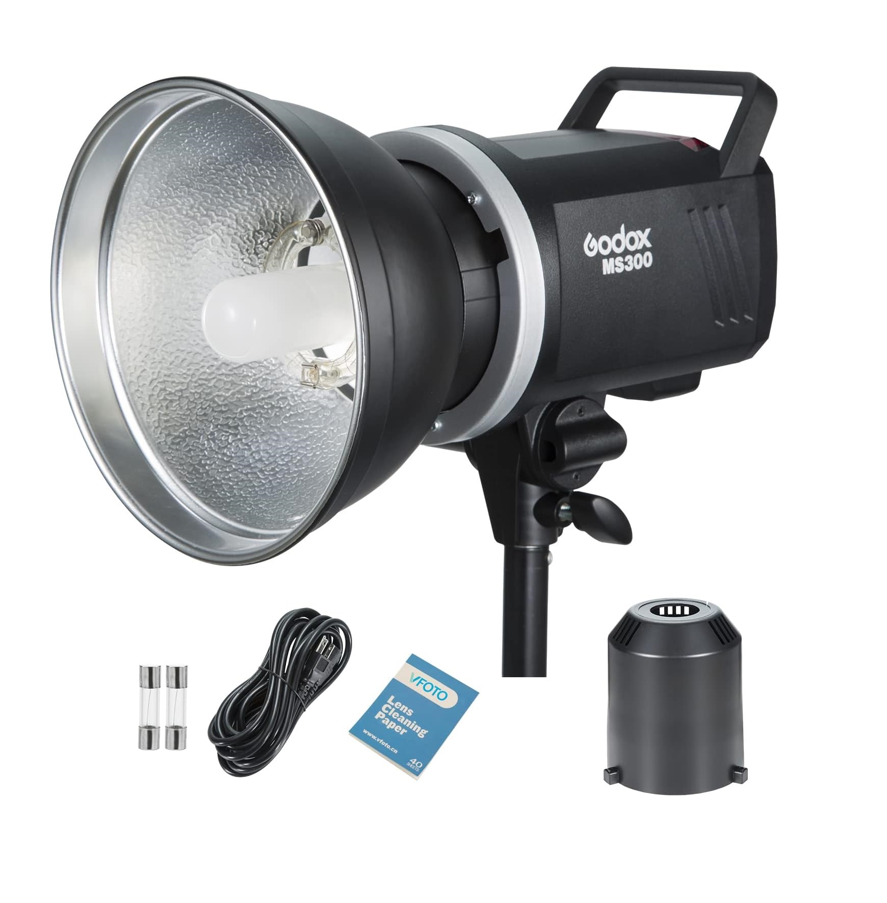 Conteúdo: Godox MS300 Studio Flash Refletor padrão frontal Lâmpada modelagem Cabo de alimentação com 5 metros Panela 2 fusíveis suplentes Manual