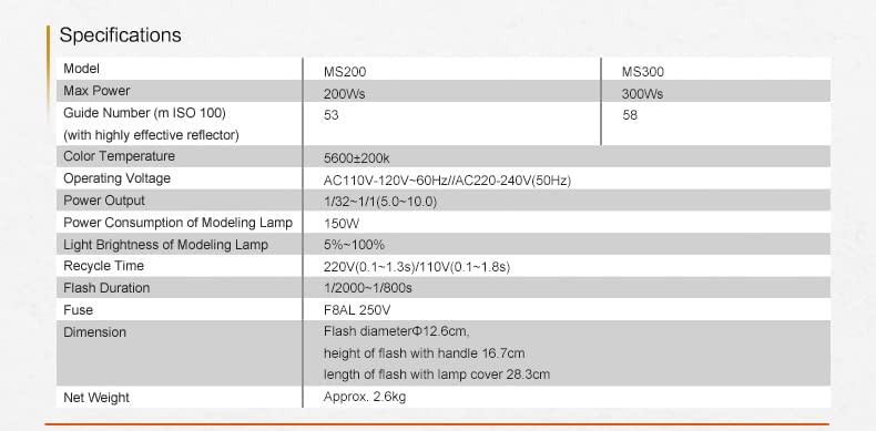 Inclui: flash MS300, refletor, lâmpada de modelagem, cabo de alimentação 5 m, 2 fusíveis e manual. Tripé de 260 cm (até 8 kg) disponível opcionalmente.