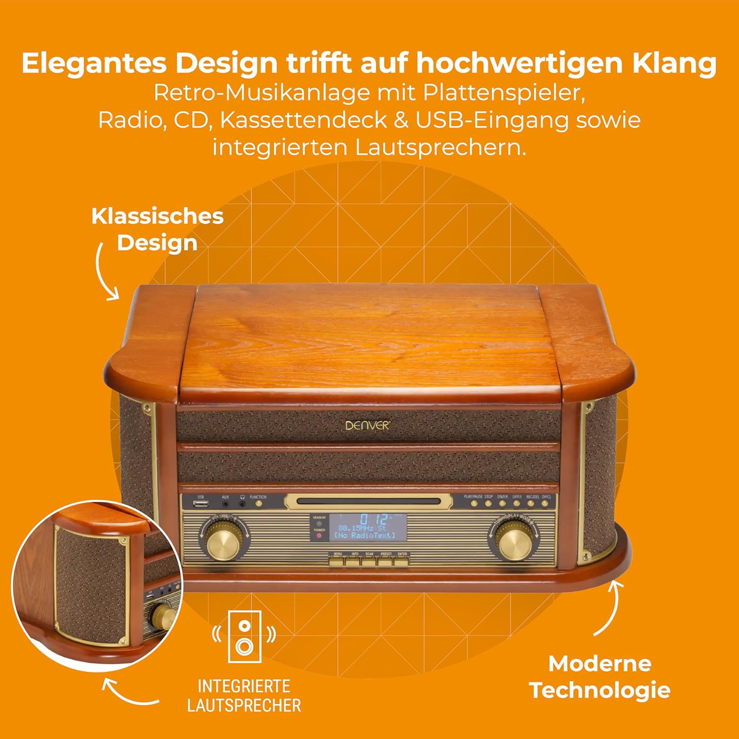 Multifunções: o sistema de música MRD-51 possui um toca-discos de vinil, sintonizador de rádio, leitor de CD, deck de cassetes e colunas estéreo num único sistema que combina as funções tradicionais com um som atualizado