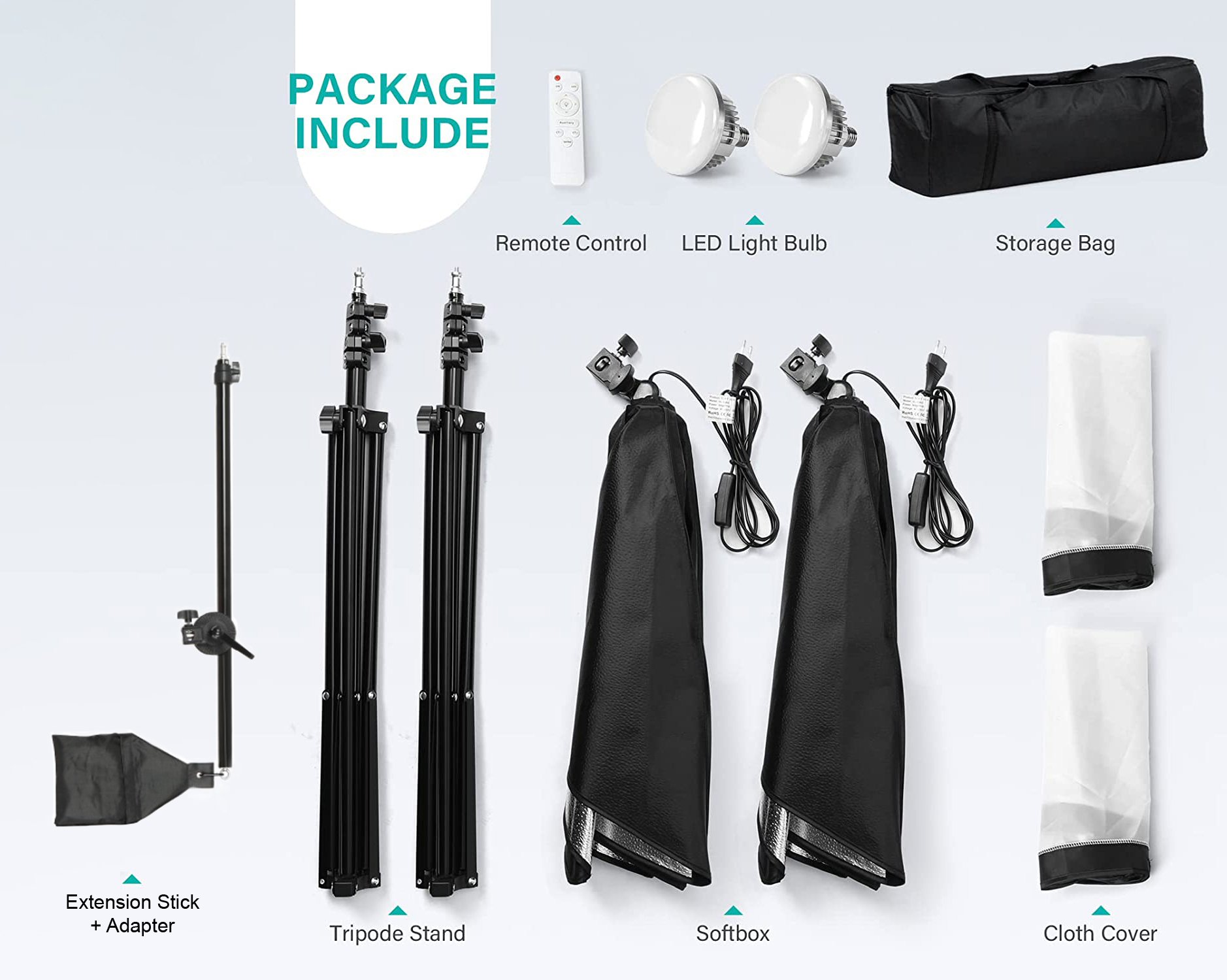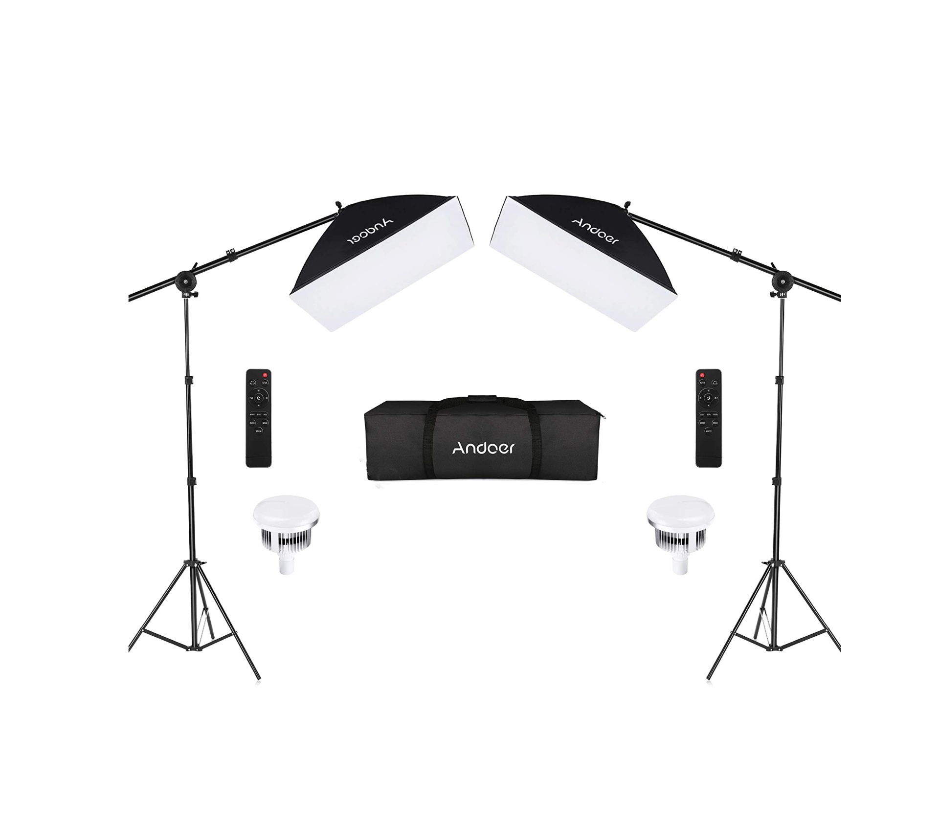 O kit inclui: 2 Softboxes 50x70cm 2 lâmpadas BI LED 2 Tripés de alumínio ajustáveis com adaptador de corrente e cabos de alimentação, 2 braços extensíveis com sacos de contrapeso e adaptadores para tripés, 2 Comandos, Saco de transporte,