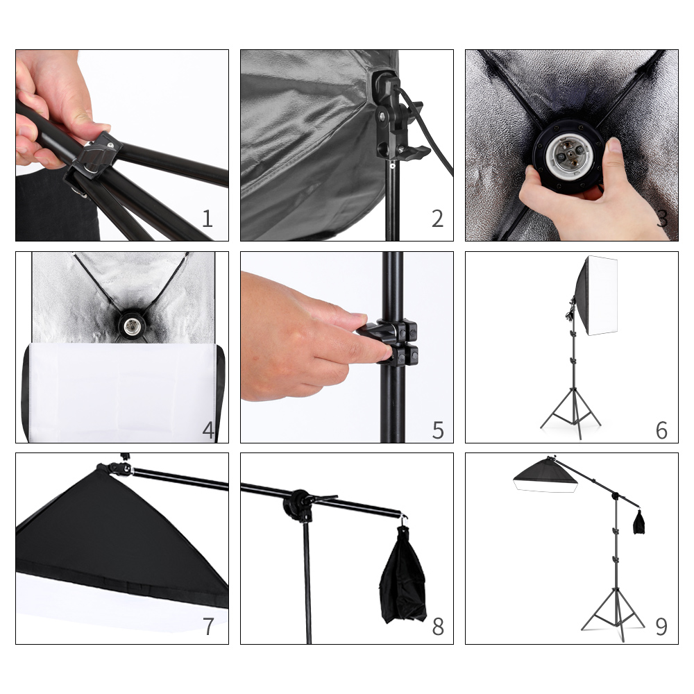 O kit inclui: 3 Softboxes 50x70cm 3 lâmpadas BI LED 3 Tripés de alumínio ajustáveis com adaptador de corrente e cabos de alimentação, 1 braço extensível com saco de contrapeso e adaptador para tripé 3 Comandos Saco de transporte