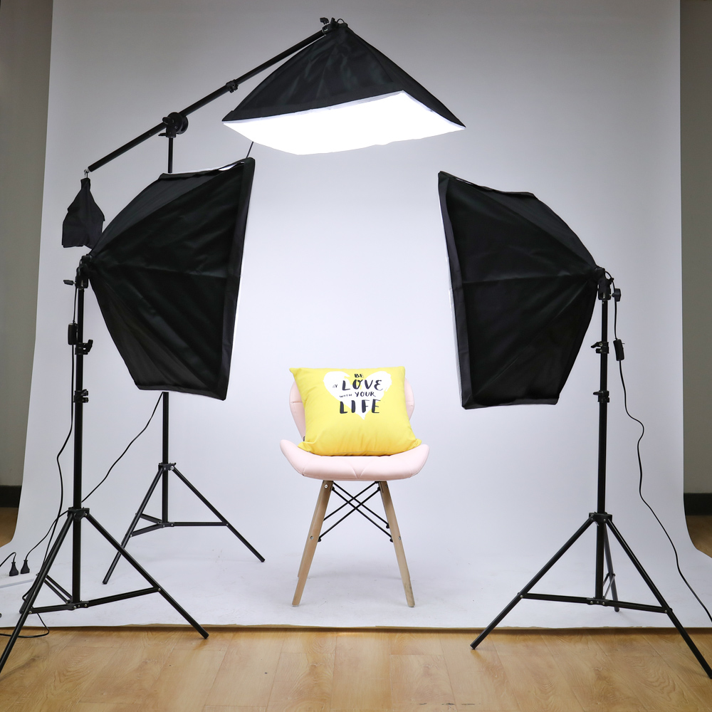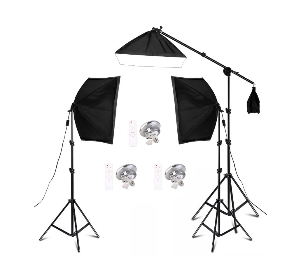 Ideal para diversos trabalhos de fotografia e vídeo. Muito mais intensidade em relação às de lâmpada fluorescente. Com regulador de potência e de cor. A temperatura de cor varia entre os 3200K e os 5500K Luz amarela e branca. Ajuste de ângulo 180º Inclui 3 comandos que permite controlar as 3 softboxes à distância individualmente.