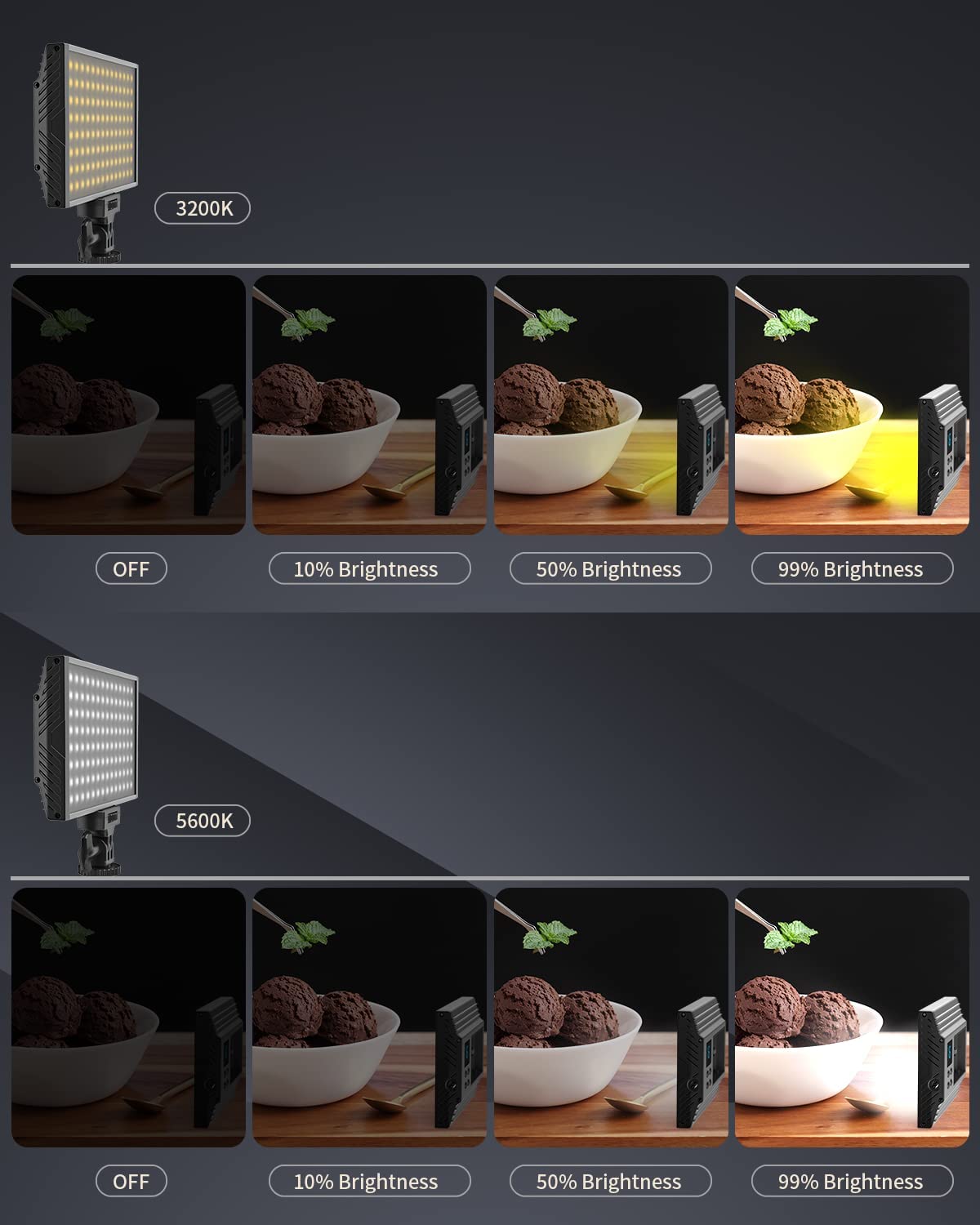 - Temperatura de cor ajustável de 3200 K ~ 5600 K, mantendo mais de 95 CRI