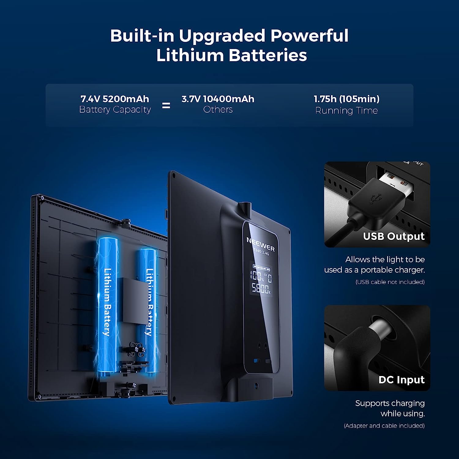 Painel ultrafino e armação de sapato frio de 1/4": o painel de luz LED ultrafino é leve e fácil de transportar. O ajuste de ângulo de 180° torna as suas fotos mais flexíveis. Um grande ecrã LCD na parte posterior da luz mostrará claramente a temperatura de cor, o brilho e o estado da bateria da luz.