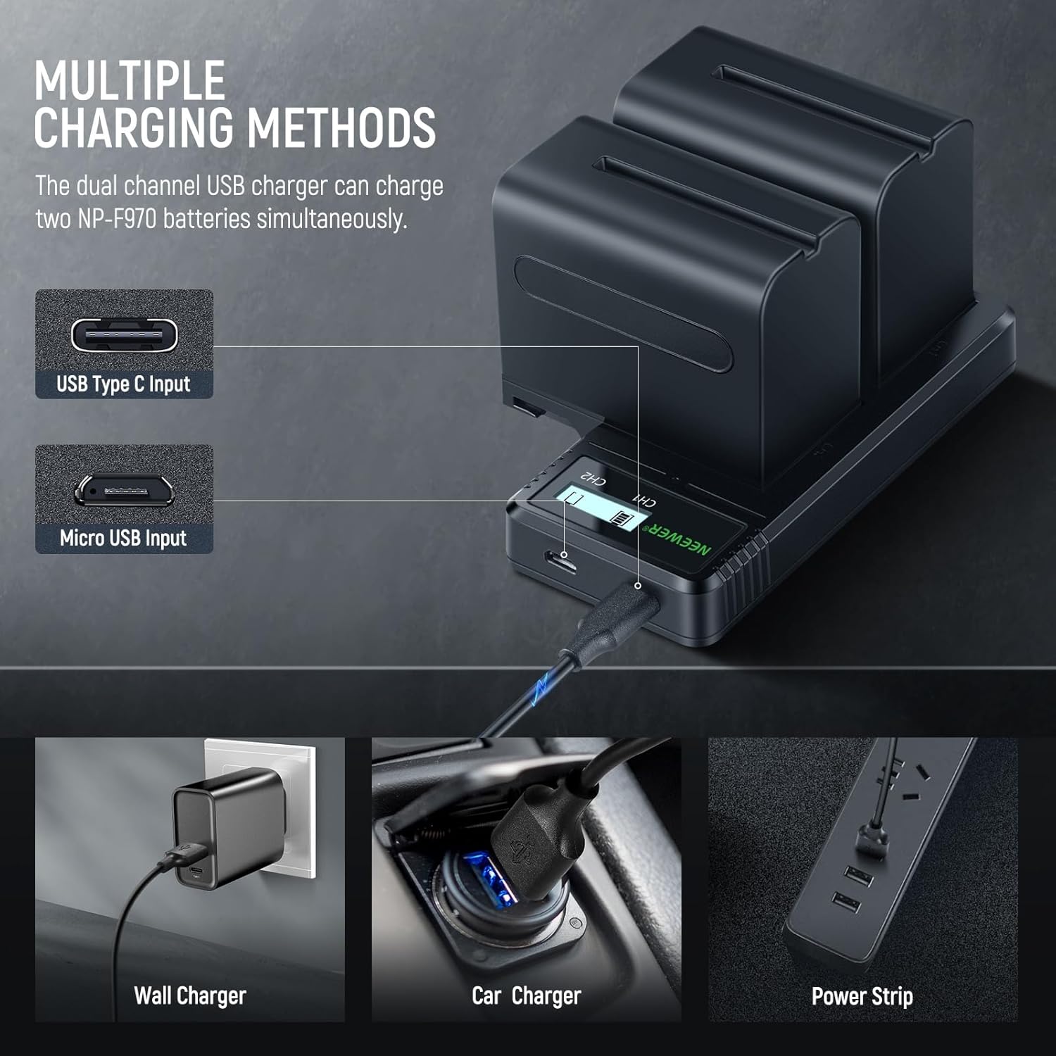 - Kit completo de iluminação para fotografia de estúdio de vídeo. - 2 painéis LED com 660LEDs cada e iluminação regulável remotamente e com display. -Poderá ser alimentado à tomada 230V com o respetivo transformador ou por baterias iões de lítio NP-F550 NP-F970, Incluído 4 baterias 6600mAh e carregadores. - Intensidade e temperatura de cor regulável e 2 temperaturas de cor: Com 330 LEDs brancos e 330 amarelos de longa duração. - CRI 97+ ; - Iluminação suave e focada: as portas permitem moldar a luz, limitando a sua propagação e os difusores de luz branca ajudam a suavizar a saída de luz. - Feito de liga de alumínio de excelente qualidade mostrando aparência elegante e simples; - O suporte de montagem em U permite que os fotógrafos ajustem o ângulo de iluminação de acordo com o ambiente de disparo.