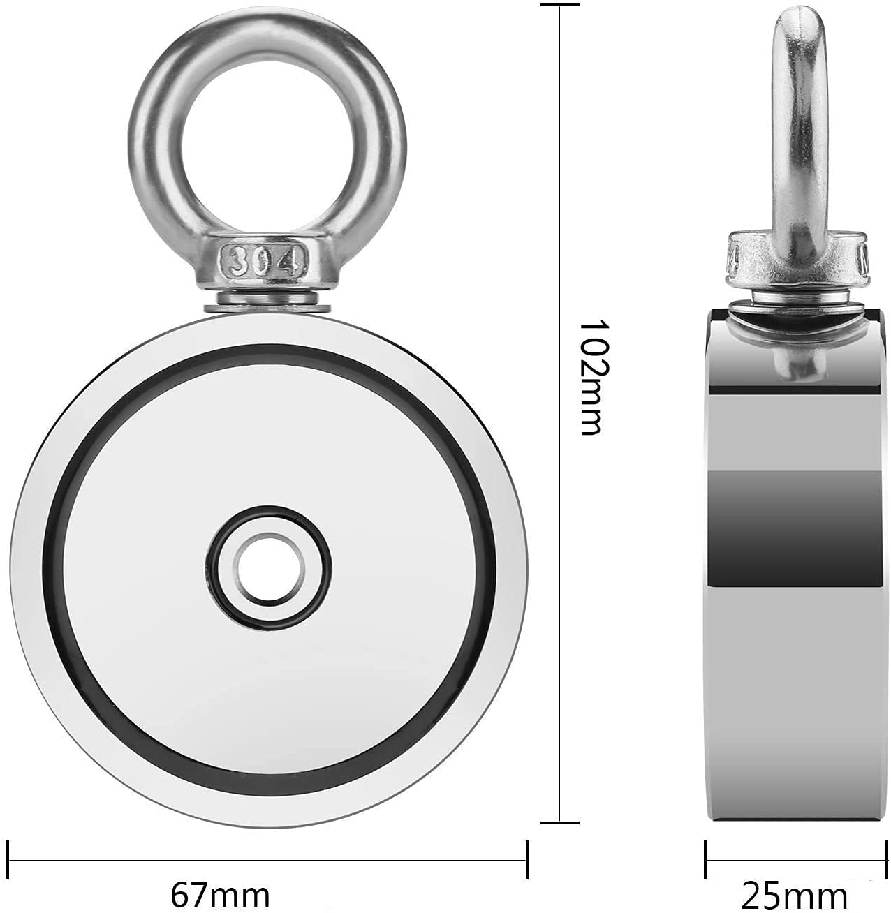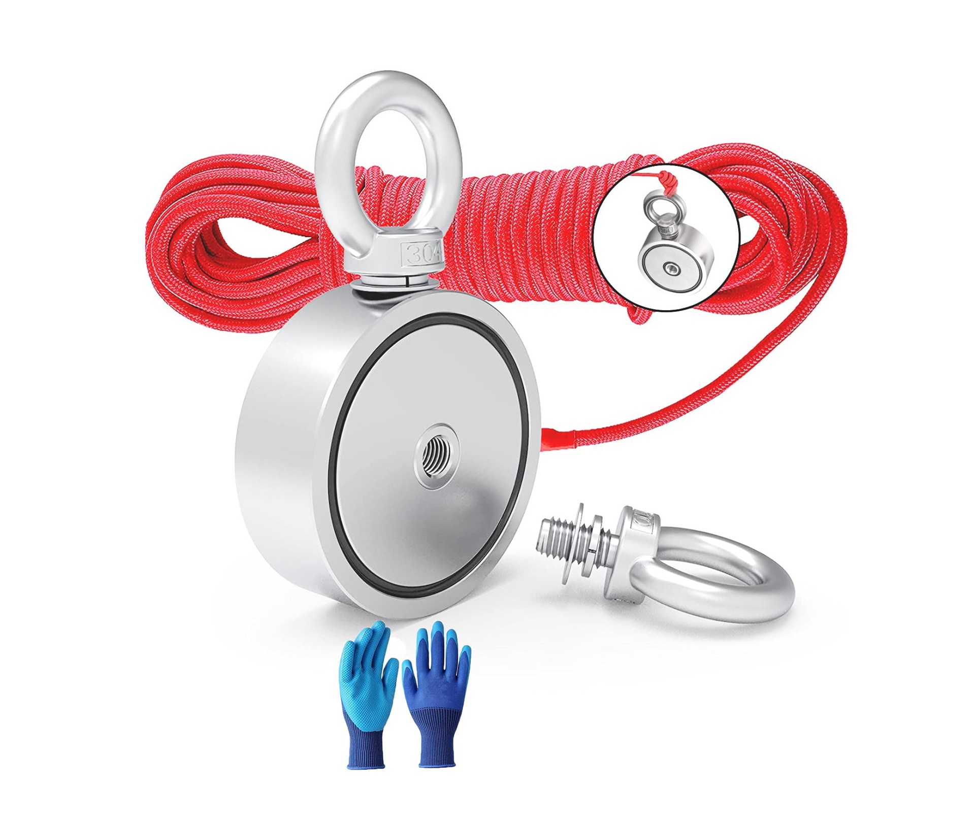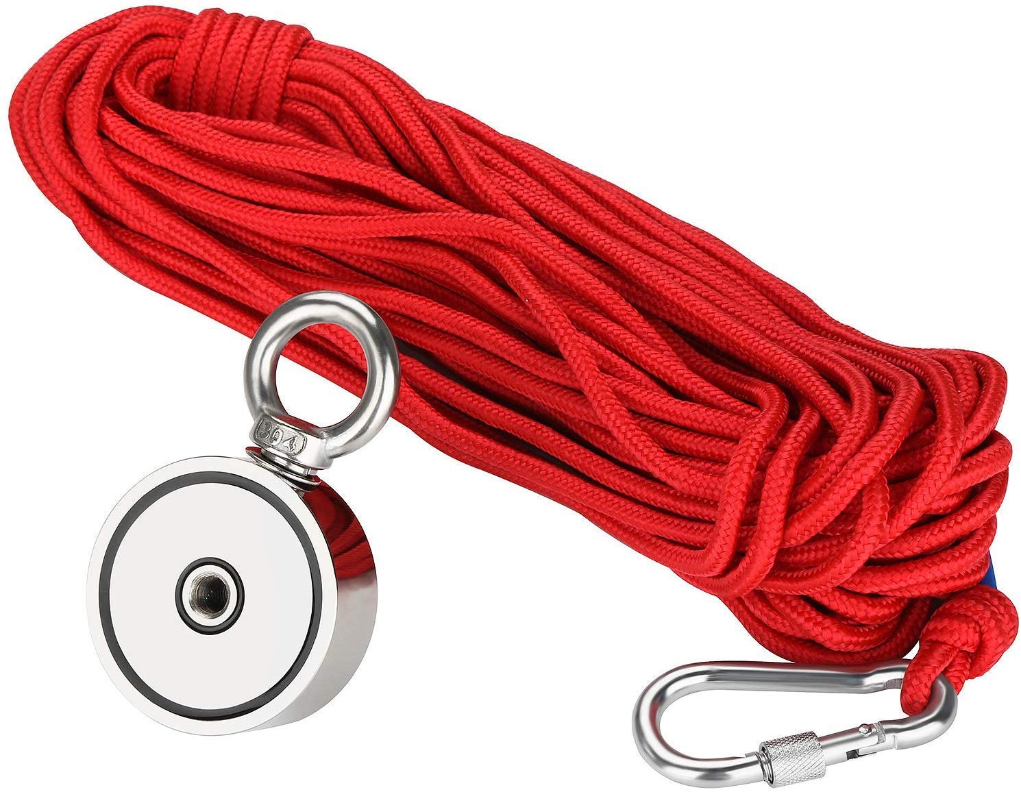 Força combinada é de até 415 kg. Acessório muito útil na caça ao tesouro, pesca, entre outros desportos derivados. Qualidade de precisão: revestimento de camada tripla de Ni + + Ni. O revestimento disponível é brilhante e resistente à oxidação. Design exclusivo com força magnética de dupla face, um íman oferece duas vezes a área de superfície para capturar objetivos. O pacote inclui um íman de dupla face de 415 kg, um par de luvas de pesca magnéticas, uma corda de pesca magnética de 20 m com um puxador máximo de 320 kg.