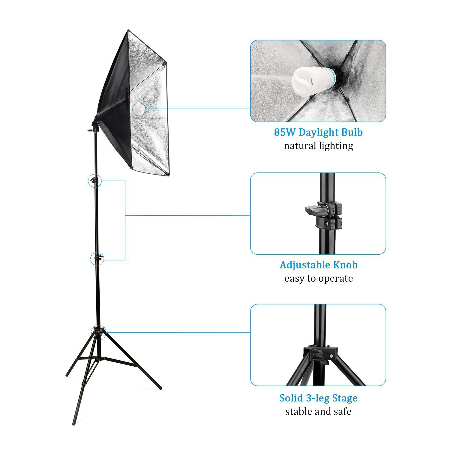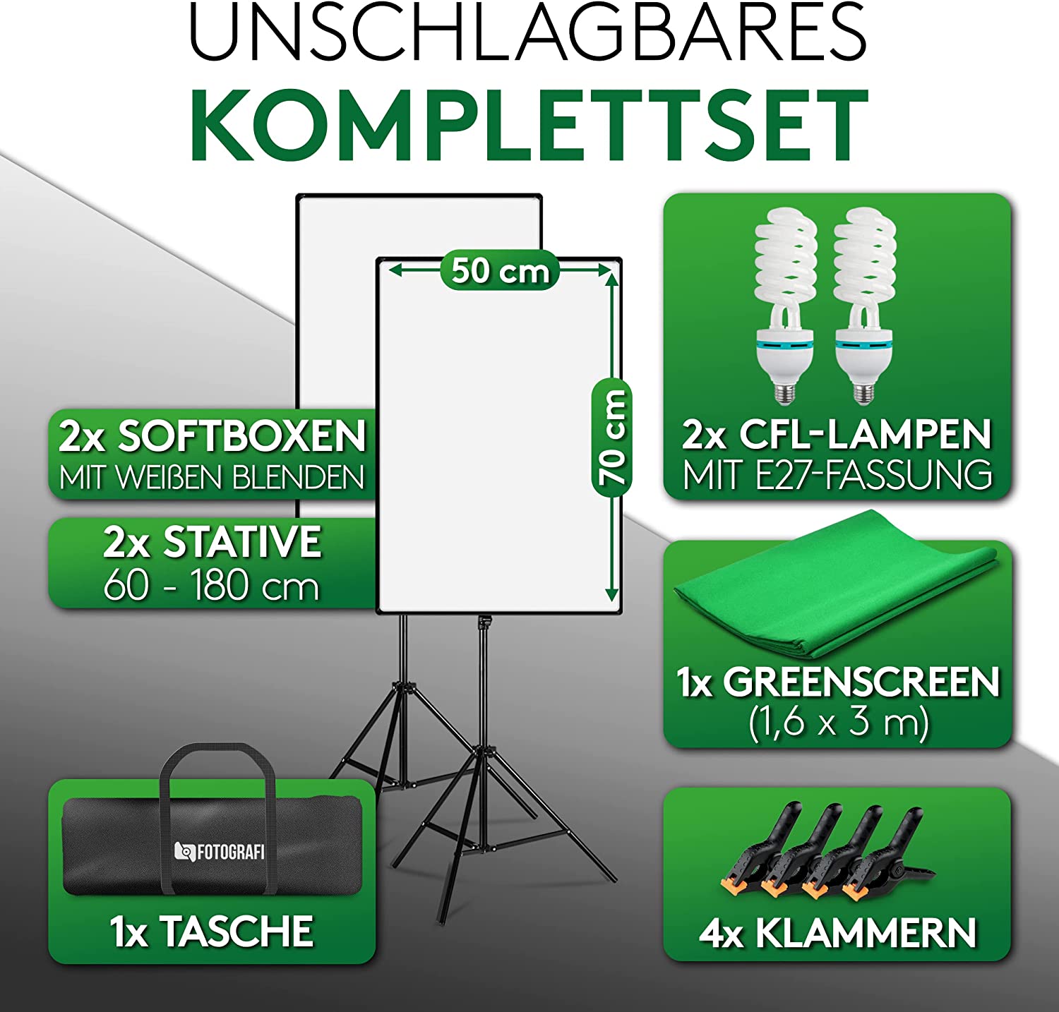 As luzes de iluminação contínua de estúdio de fotografia / vídeo incluem 2 softboxes com 50x70cm. Maximiza o efeito e suaviza a luz dura, bem como eliminação de sombras. Fácil de montar e desmontar. Ângulo ajustável. Tripés ajustáveis em altura de 68 a 200cm. Incluídas 2 lâmpadas com temperatura de 5500k, que oferecem a mesma quantidade de luz que as fluorescentes, com menos da metade do consumo de energia. Incluído um fundo chroma verde 150x300cm + 4 molas de fixação.