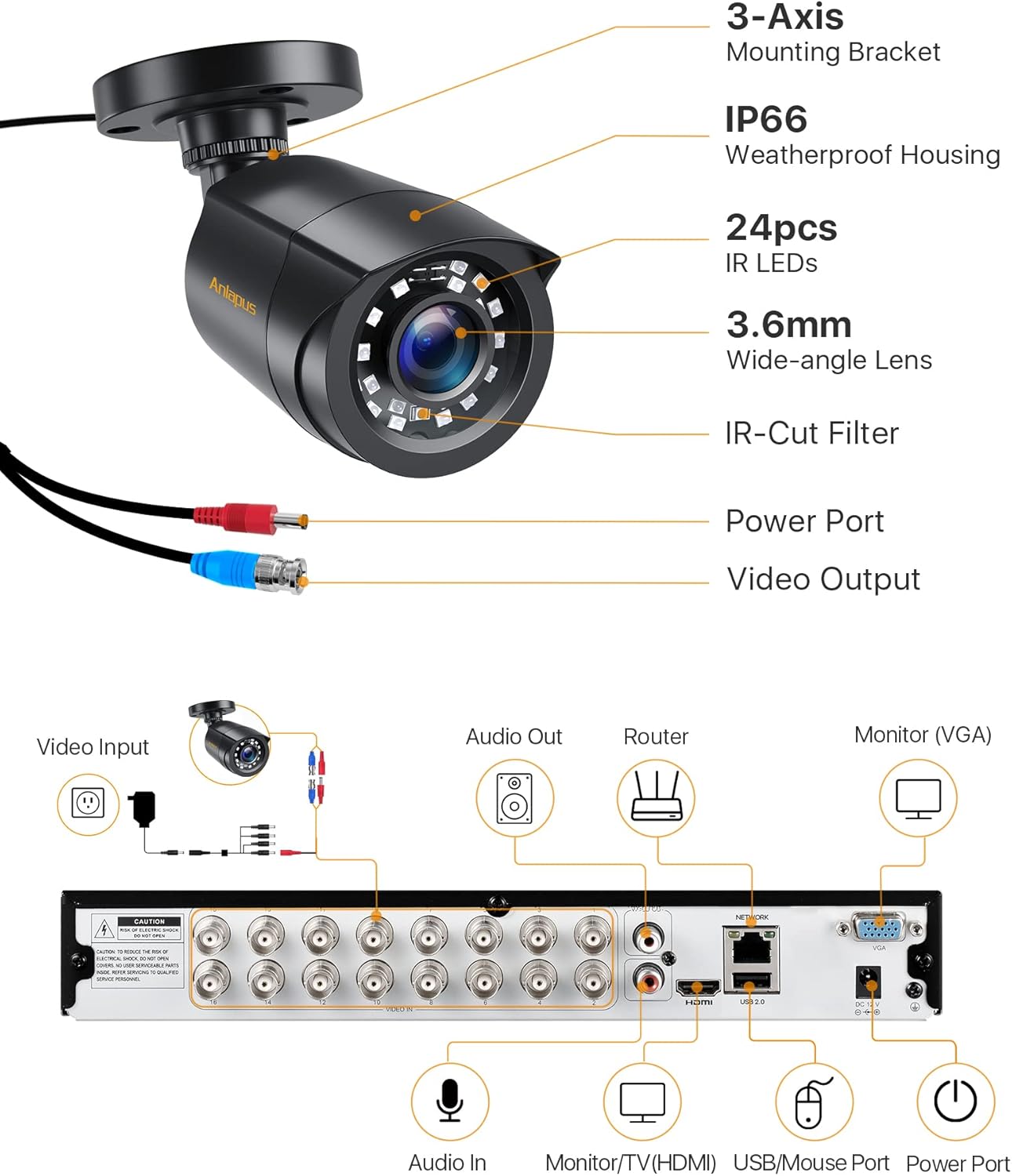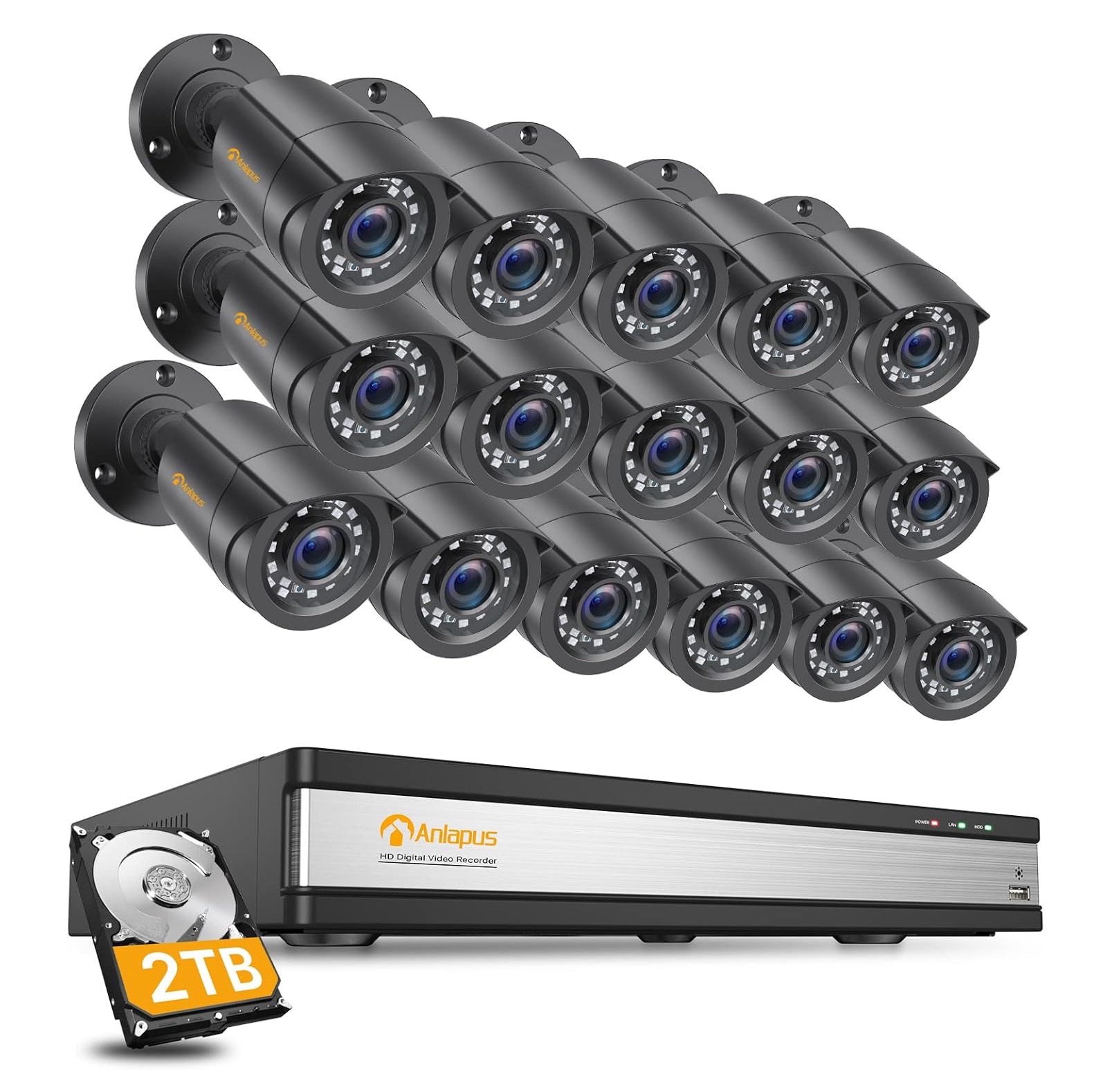 > Gravador DVR com 16 câmaras bala à prova de água com disco rígido de 2 TB para gravação 24/7. Gravação vídeo 1080p