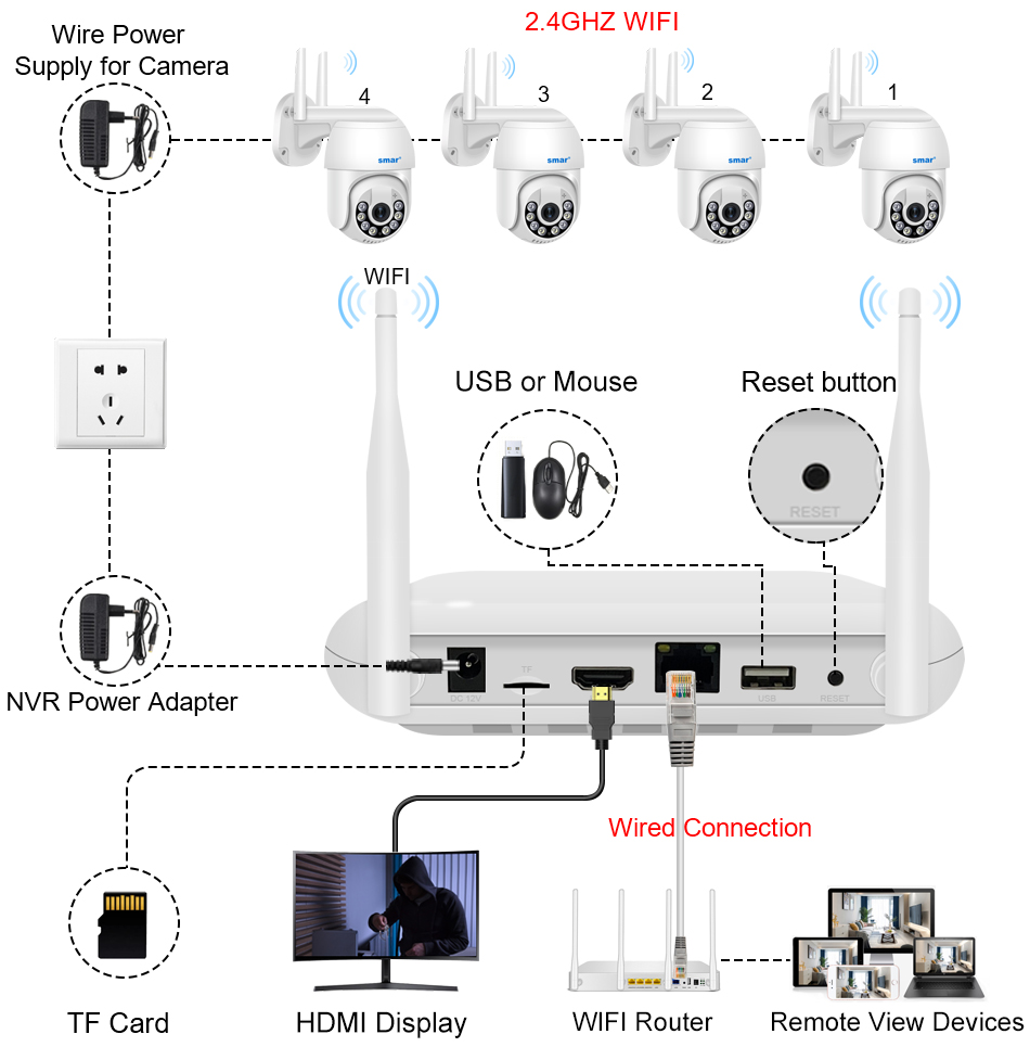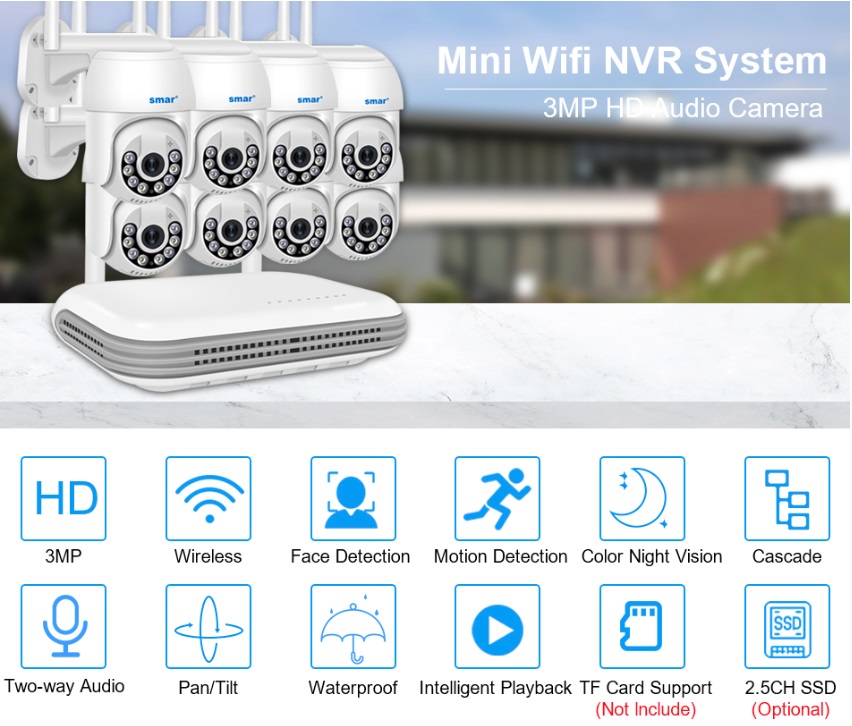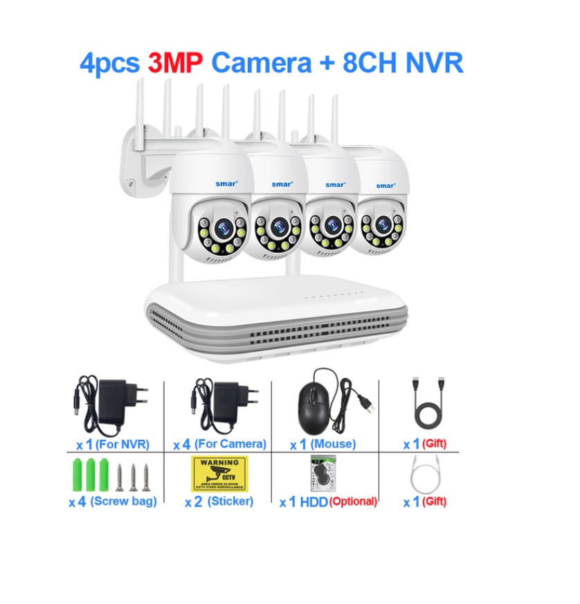 Principais características 1x NVR gravação. 8 canais. Inclui 4 câmaras, mas pode optar por adicionar até 8 câmaras 4x câmaras 3 MP HD 1080P rotativas Conexão de cabo LAN ou sem fio entre NVR e IPC Deteção de pessoas Deteção de movimento. Visão noturna Áudio bi-direcional. Rotação manual ou automática das câmaras. Câmaras impermeáveis Intelligente playback. Armazenamento: cartão micro SD ou HDD / SSD 2,5" (não incluido)