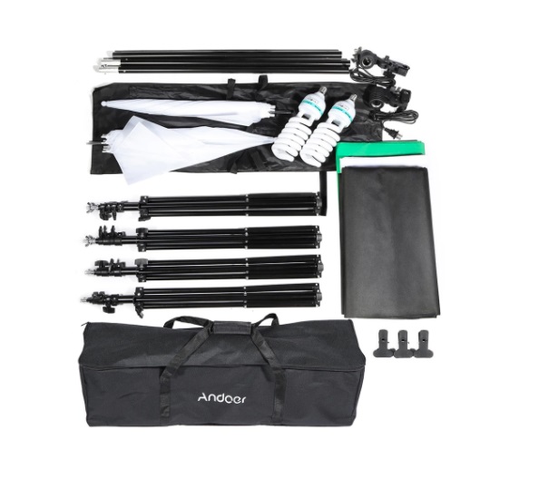 Este kits de iluminação são portáteis e usados para retratos ou fotografia de produto.