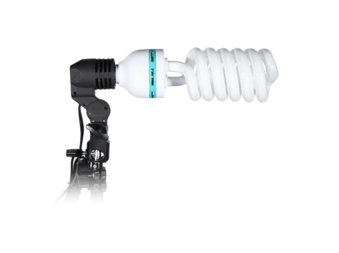 Lâmpadas de 85w fluorescente temperatura de cor 5500k. Equipado com suporte de lâmpada, pode montar lâmpada e guarda-chuva no Suporte do tripé de alumínio, que pode ser extensível em altura até 1,9m Estrutura de suporte de fundos extensível em largura até 3m e em altura até 1,9m Inclui 3 molas de suporte. Guarda chuvas brancos com 80cm de diâmetro