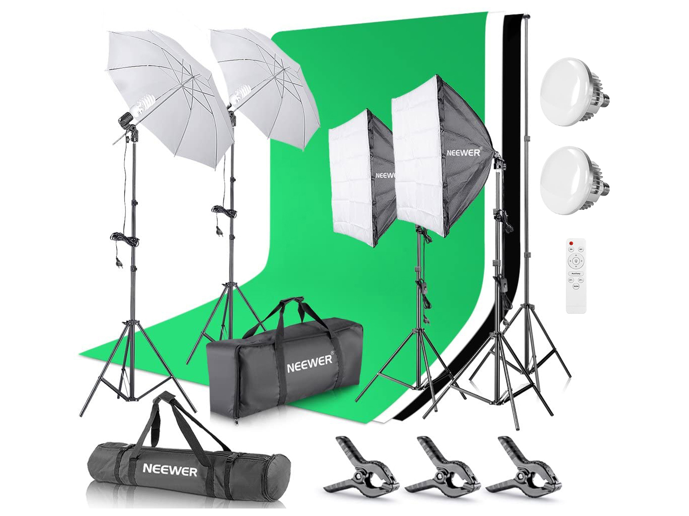 É fácil de instalar sem ferramentas, tanto a altura do fundo como a luz são ajustáveis e três fundos fotográficos de cores diferentes (Verde / Preto / Branco) permitem-lhe alterar fundos facilmente, perfeito para fotografia de retrato.