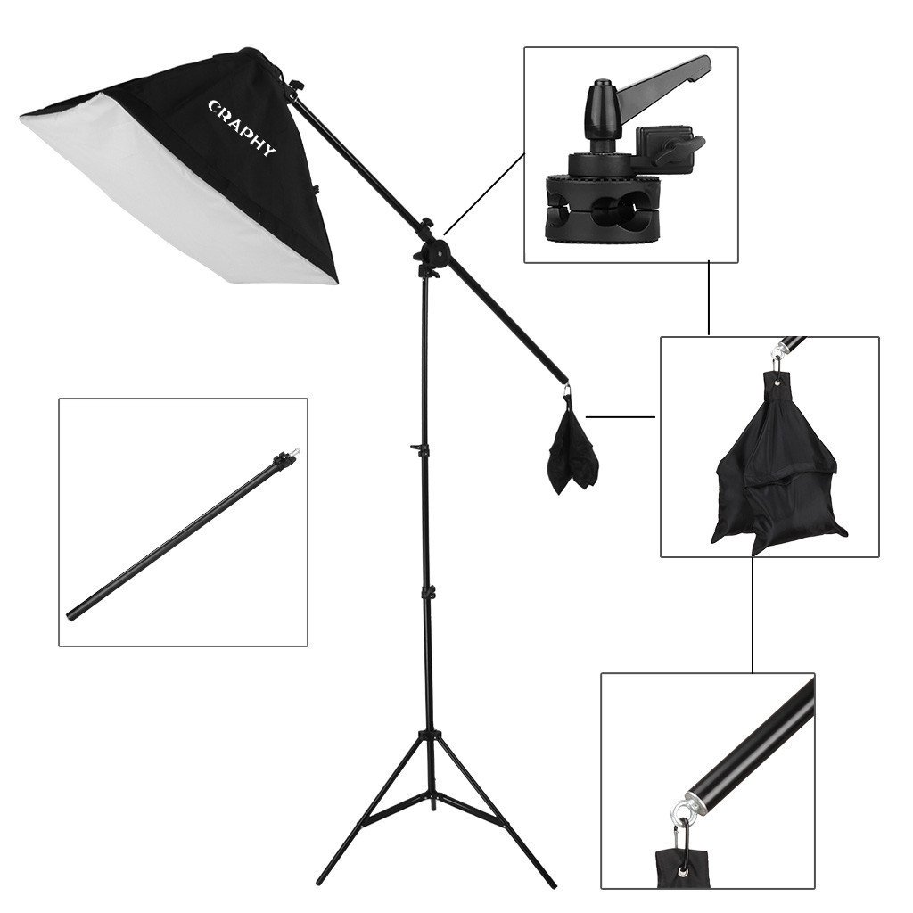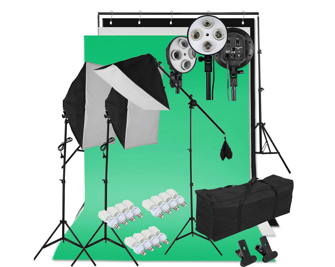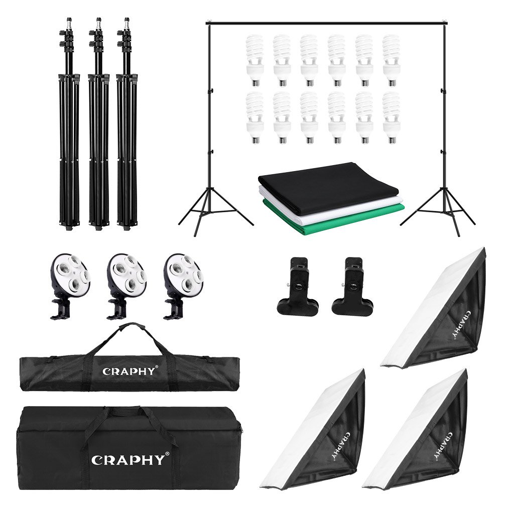 O KIT inclui: 12 lâmpadas de 45w: temperatura de cor 5500 K cada uma com uma intensidade equivalente a 200W de uma lâmpada de filamento. Casquilho E27 3 caixas de luz: e respetivos tripés altura ajustável de 65 cm a 210 cm, parafuso 1/4" 3 fundos em tecido sintético e suportes. Aconselhável passar a ferro a baixas temperaturas (80º) para retirar eventuais rugas que ganham no transporte. Lavar a frio. Estrutura para fundos com barra extensiva de 115 até 300cm e tripés altura ajustável de 65 cm a 210 2 bolsas: 1 bolsa para o kit e 1 bolsa para o suporte inferior para fácil transporte e armazenamento