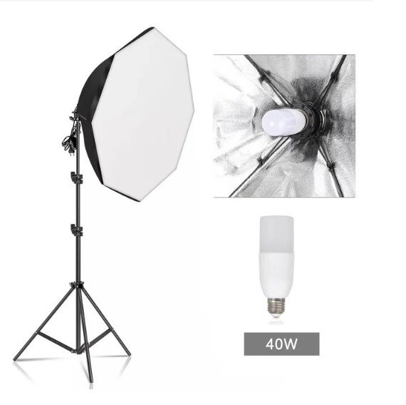 As luzes de iluminação contínua de estúdio de fotografia / vídeo incluem 1/2/3 soft boxes octagonais de 70cm. Maximiza o efeito e suaviza a luz dura, bem como eliminação de sombras. Fácil de montar e desmontar. Ângulo ajustável. Tripés ajustáveis em altura de 68 a 200cm. Incluídas lâmpadas LED com temperatura de 5500k, equivalente às de 105W florescentes, mas com um consumo inferior