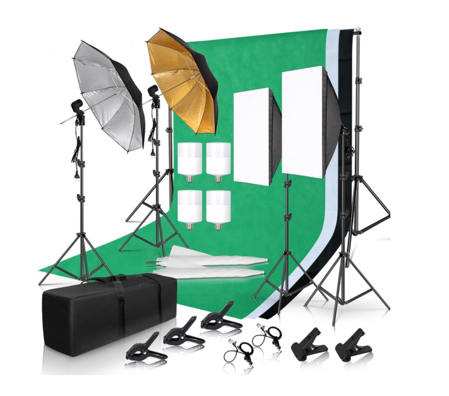 Conteúdo: - Estrutura dos fundos: 2 tripés + barras - Fundos: preto, branco e verde - 2x guarda chuvas 83cm diâmetro brancos -1x refletor 83cm dourado -1x refletor 83cm prateado - 2x encaixes E27 (para as lâmpadas dos guarda chuvas) - 2x tripés extensíveis 80-200cm - 4x lâmpadas 55W 5500k - 2x softboxes 50x70 - 4x molas fixação de fundo 11.4cm (4,5") - 1x saco de transporte para a estrutura - 1 refletor 5-1 80cm
