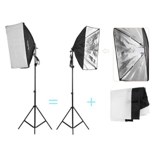 Softboxes 50x70 Fundos em TNT. Tamanho 1,5x3m Oferta também de refletor 5 em 1 de 80cm. Sombrinhas de 84cm. 2 brancas translucidas com 1 dourada e 1 prateada. Lâmpadas LED de luz branca.