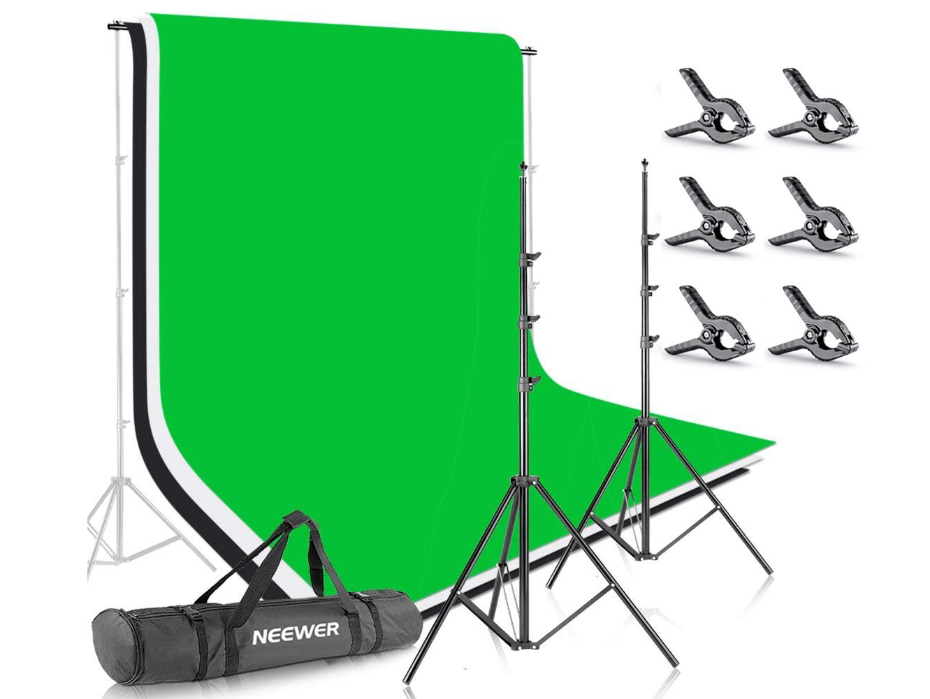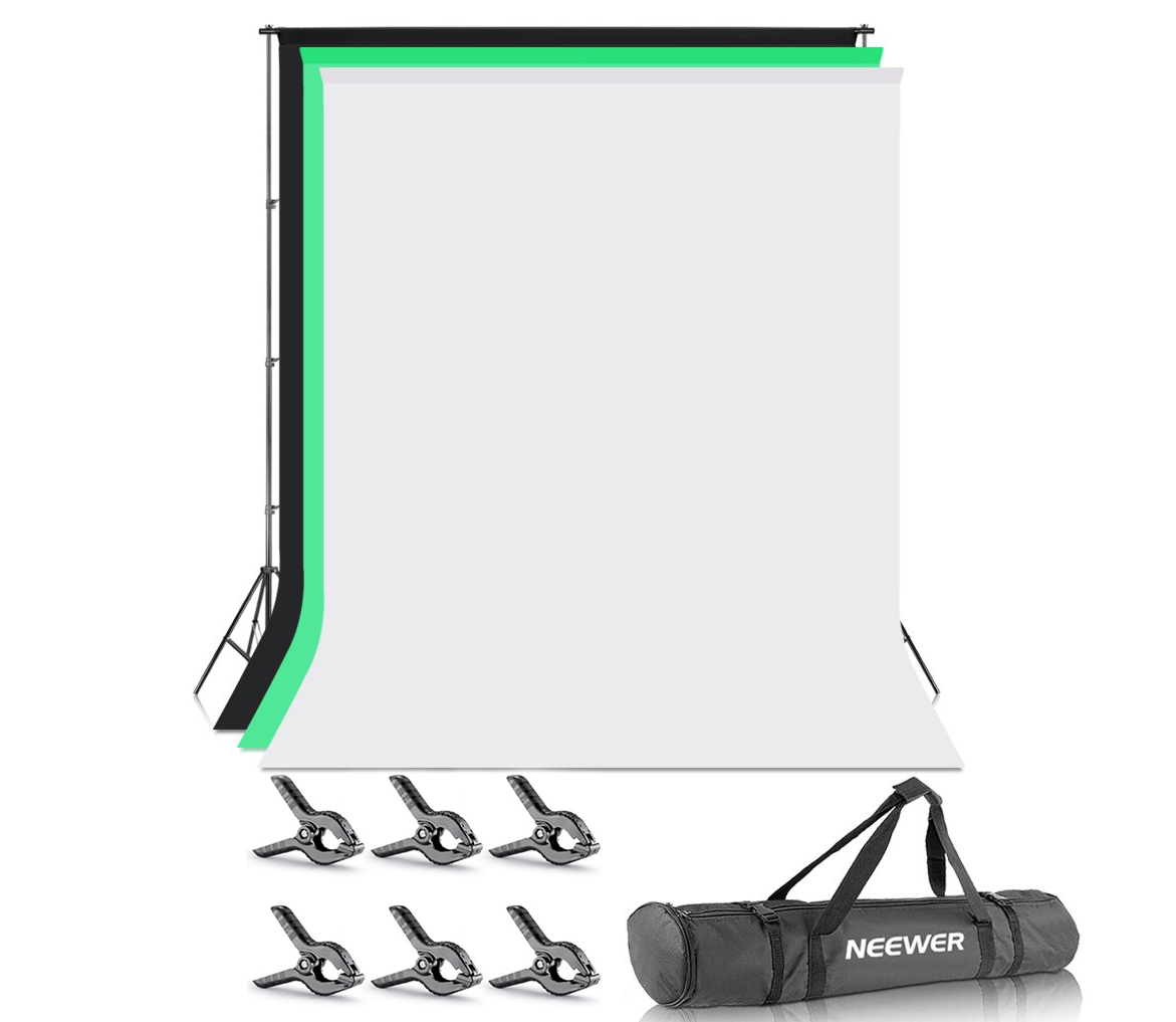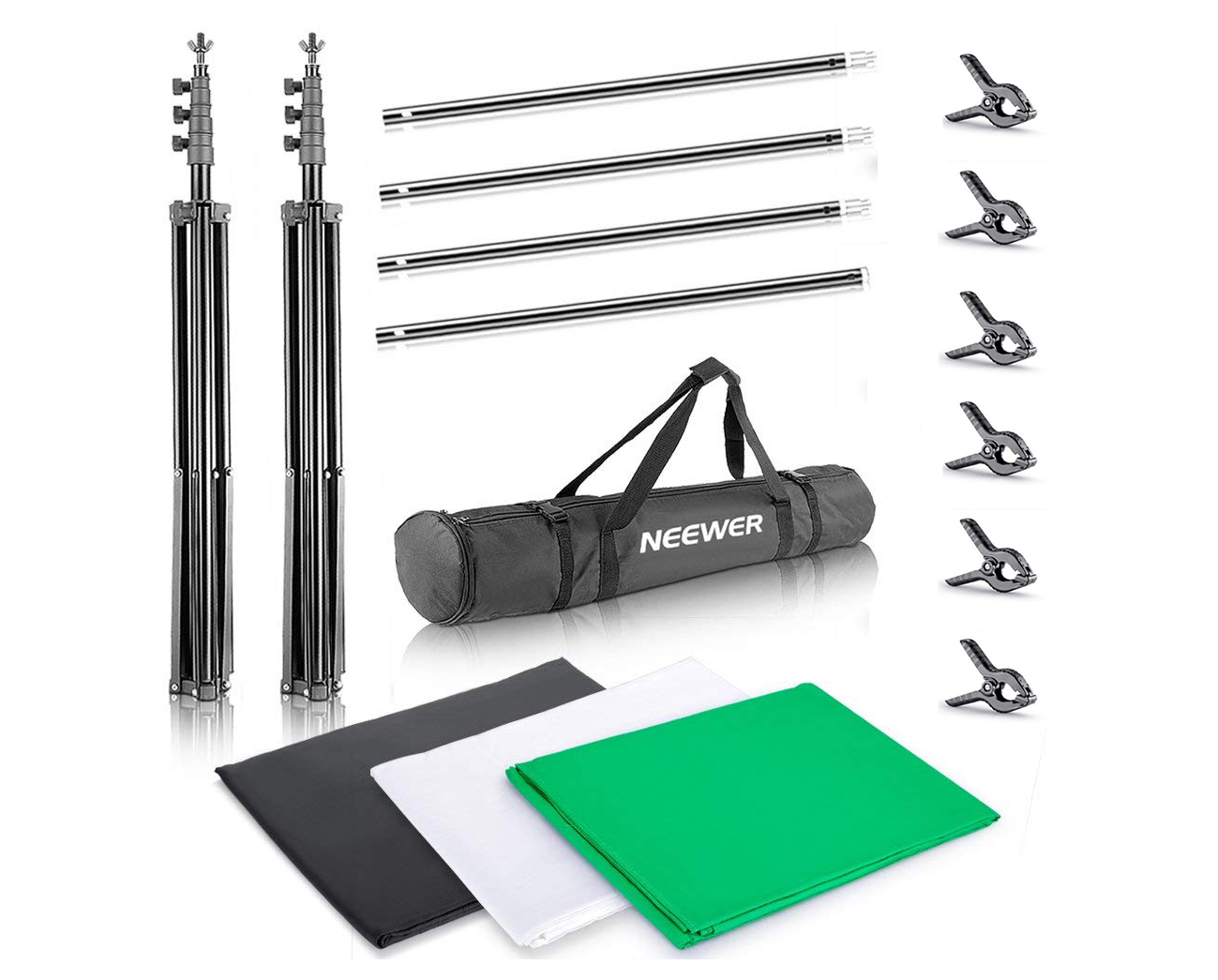 Conteúdo do kit: 2 suportes de fundo 4 barras transversal 1 fundo branco 1 fundo preto 1 fundo verde 3 molas 1 saco de transporte