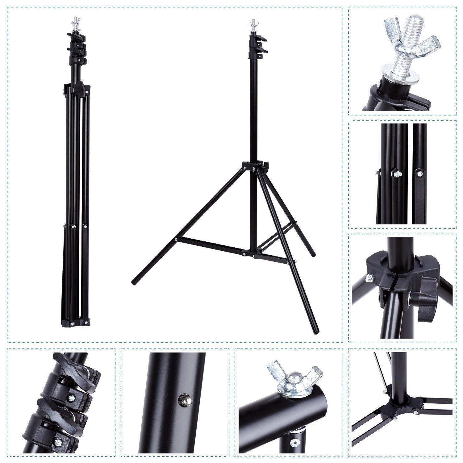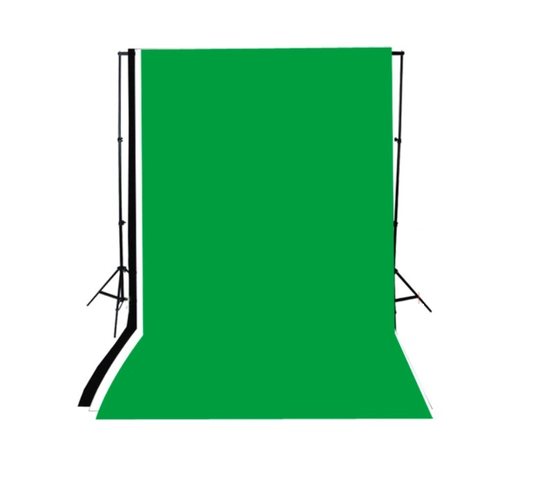 Conteúdo do kit: 2 tripés, 2 barras transversais ajustáveis em largura, 1 fundo branco, 1 fundo preto, 1 fundo verde, 3 molas , 1 saco de transporte,