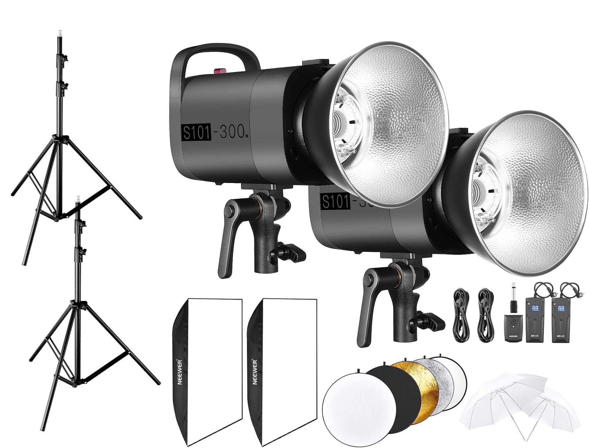 Duas luzes estroboscópicas de estúdio de 300 W com uma temperatura de cor constante de 5600 K fornecem uma lanterna potente e confiável para fotografias fixas, produtos, retratos e casamentos. A capa de liga de alumínio é robusta o suficiente para suportar anos de desgast.
