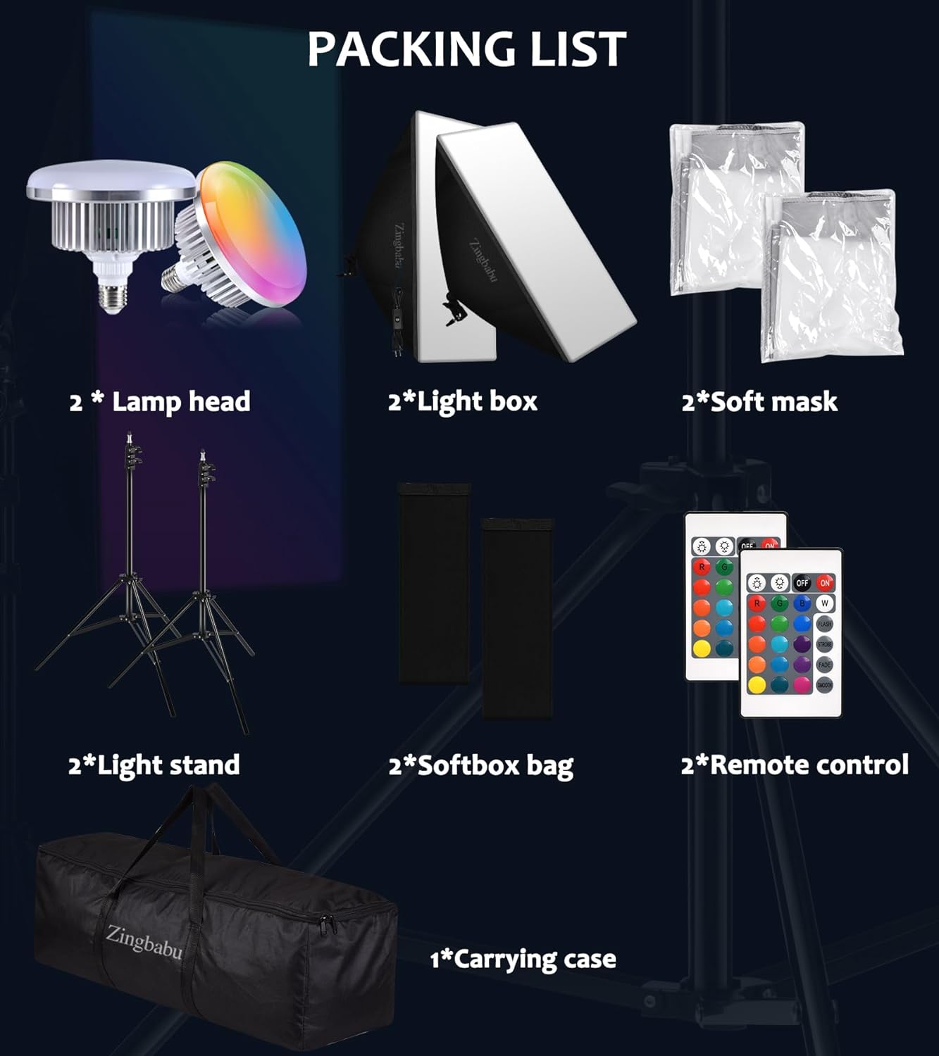 2 módulos LED RGB 2 tripés ajustáveis 2 softboxes 50x70 2 comandos 1 saco de transporte