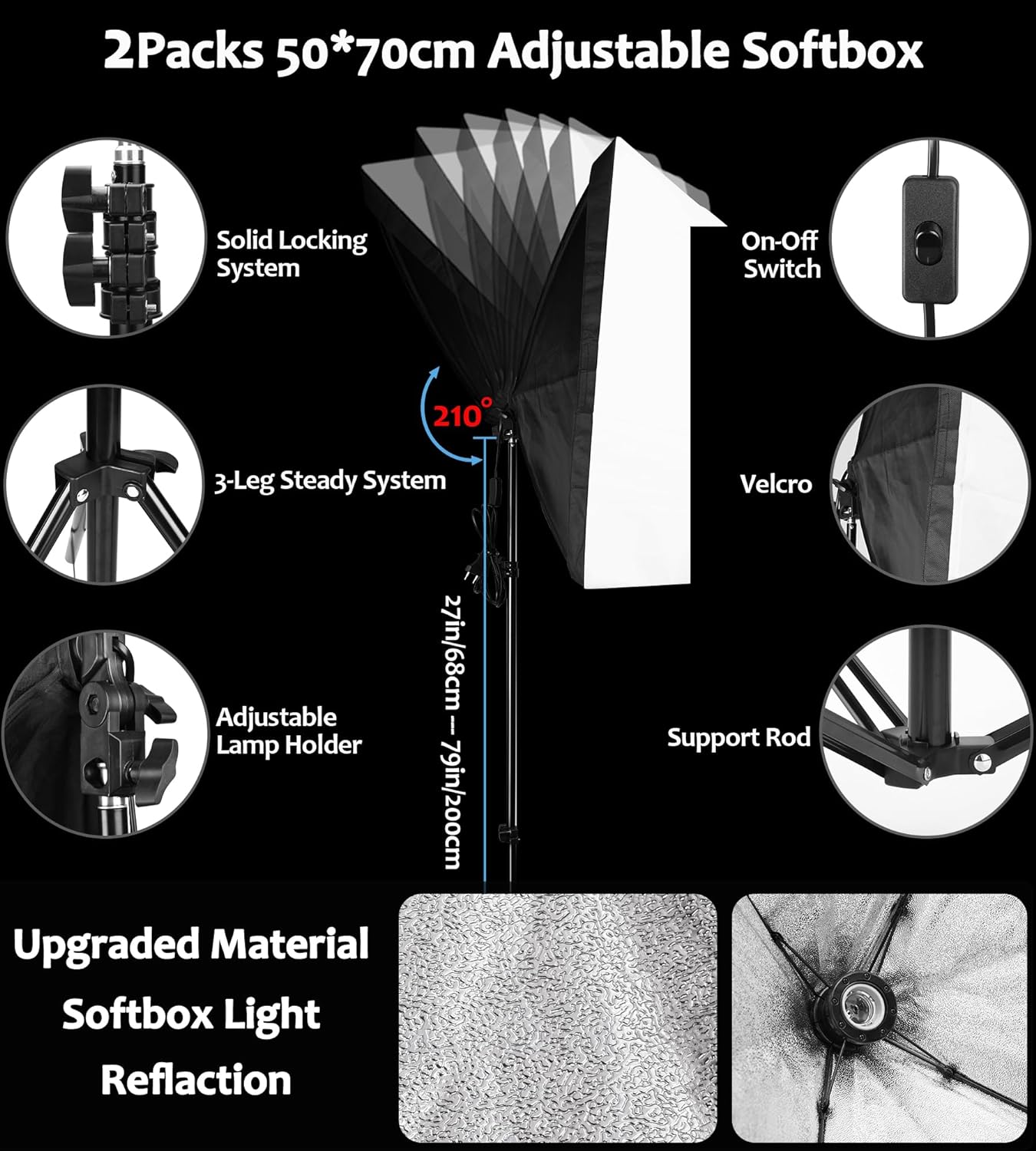 Softbox de 50 x 70 cm: é feito de material de alta qualidade, que pode obter um bom efeito refletor. A face interna prateada pode minimizar a perda de luz e manter um ângulo de difusão perfeito. A capa branca macia fortalece o efeito da luz suave, também pode evitar a água na tomada externa de iluminação fotográfica.