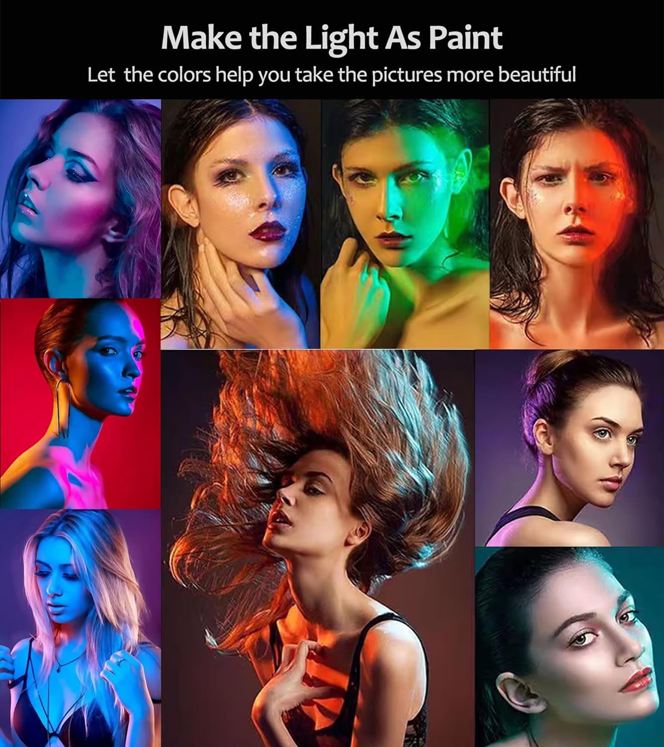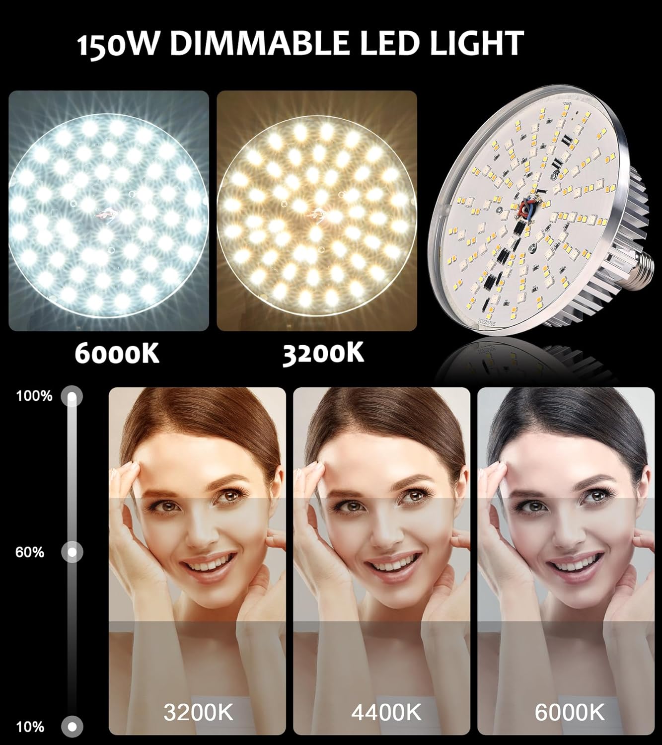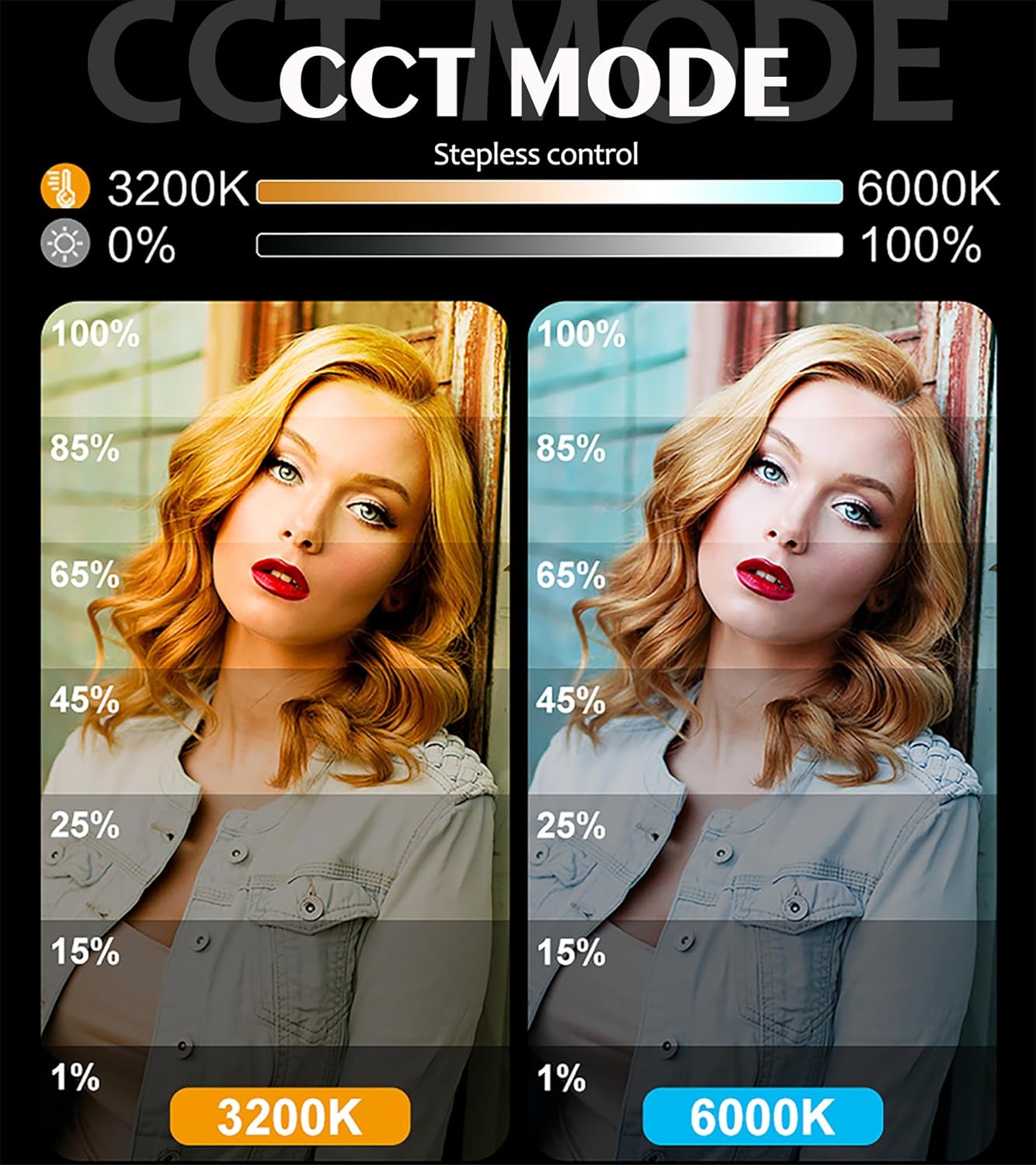 Lâmpadas LED reguláveis 144 LEDs e CRI 95+, com 2 modos de cor: modo CCT (3200-6000 K) e modo RGB (25% - 50% - 75% - 100%).