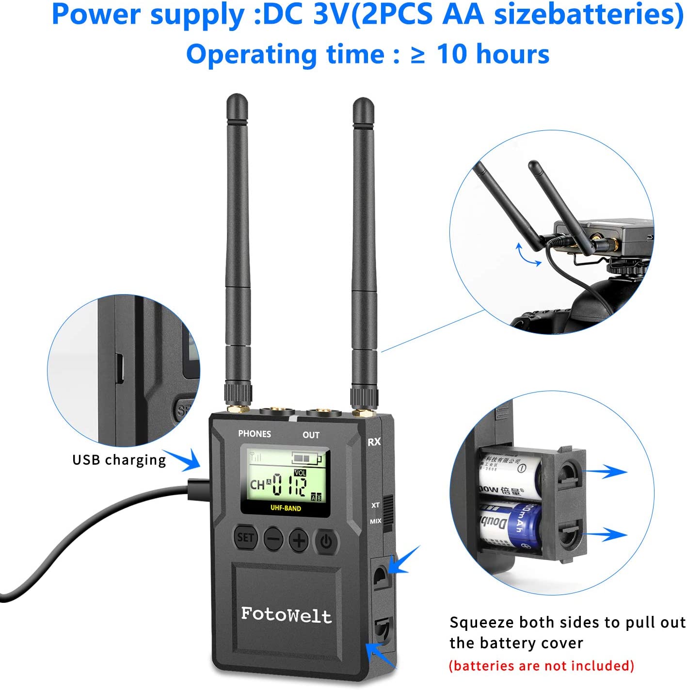 Alimentação de 2 pilhas AA ou fonte de alimentação DC-5V DC. Autonomia até 10h