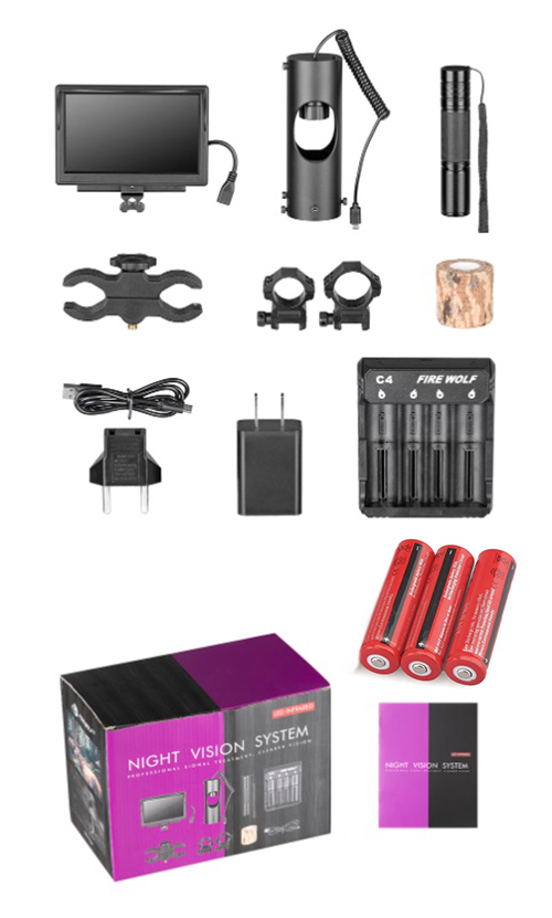 Especificações: Material principal: ABS Alimentação: baterias 18 650 (incluídas) Tensão de funcionamento: 3.7v corrente contínua Cartão de armazenamento: até 8 GB Desempenho ótico: Ampliação: 5 Dimensão dos objetivos: 3535mm Fov: 7 ° x5.25 ° Escala ajustável ocular: ± 0.5 Distância de observação (ambiente de pouca luz): 2m ∞ Distância de observação (ambiente escuro completo): 2m ~ 200m desempenho digital: Sensor de baixa iluminação: De alta Definição1 / 3 COMS Pixel: 130W Foto: 1280 x 1024 Vídeo: 720P Modelo: Firewolf FW54