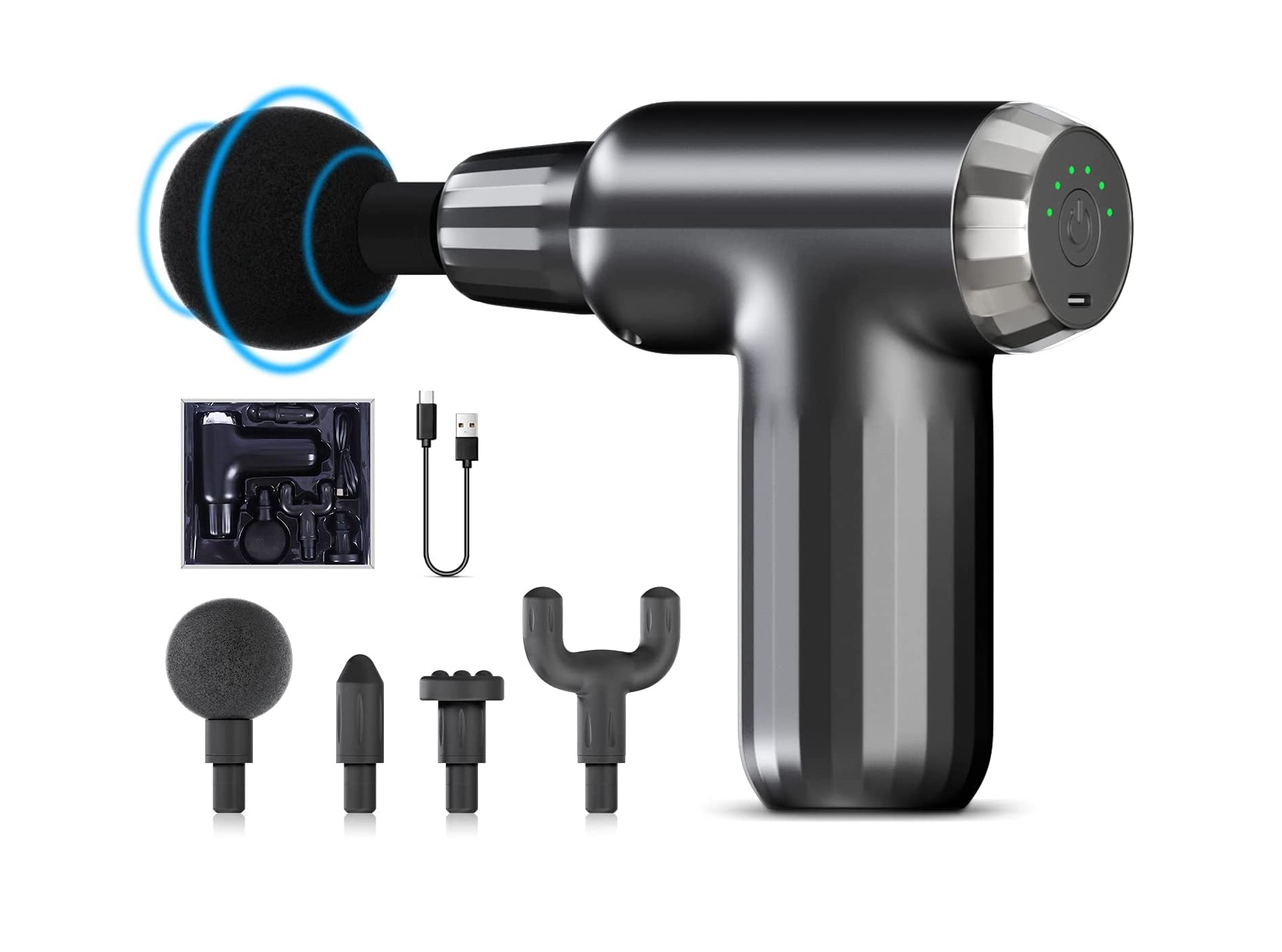 - 4 Cabeças de Massagem e 6 Velocidades. As cabeças de massagem em diferentes formas permitem atingir qualquer músculo e atender às diferentes necessidades das partes do corpo durante a massagem. Ideal para massagear o pescoço, costas, braços e pernas. - 20 níveis de velocidade. Dependendo da condição muscular e da capacidade de carga, cada pessoa pode escolher a força adequada para aplicá-la. - Ecrã LCD que mostra a bateria restante e a velocidade atual. Com os os botões "+" e "-" controla a velocidade. - Bateria de lítio de 1800 mAh de alta qualidade, portanto, em velocidade máxima, pode ser usado continuamente por 2 horas. - Bastante silencioso - Punho de silicone resistente e antideslizante torna a pistola de massagem muscular profissional mais fácil e confortável de segurar, proporcionando-lhe mais prazer. - Inclui uma mala de transporte para a máquina e todos os acessórios.