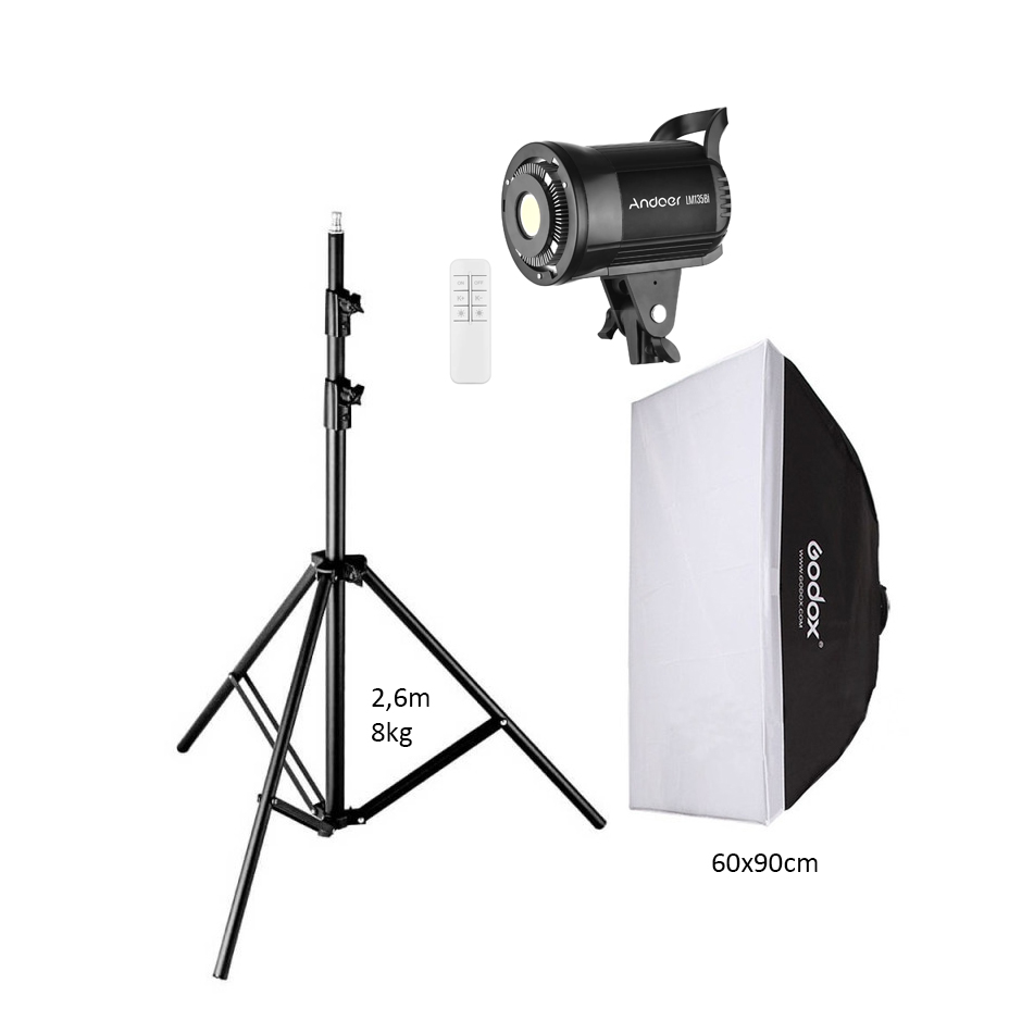 Opção de incluir tripé extensível até 2,6m de altura e suporta até 8kg e softbox 60x90 com montagens bowens.