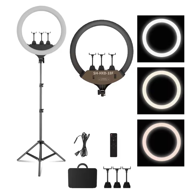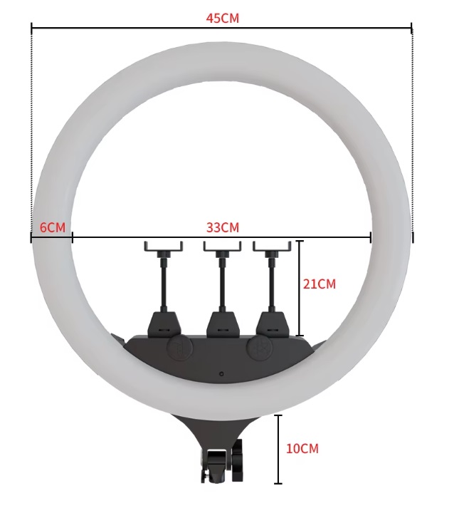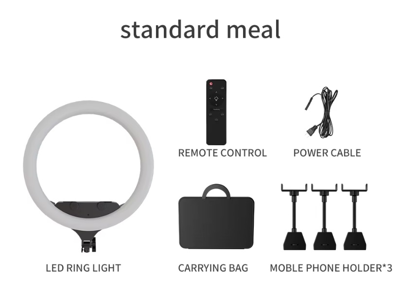 Incluído: Anel 46cm bicolor LED, Tripé Comando Bluetooth para câmara ou telemóvel, Comando regulação anel, Suporte de telemóvel, Fonte alimentação, Suporte rotativo para DSLR.