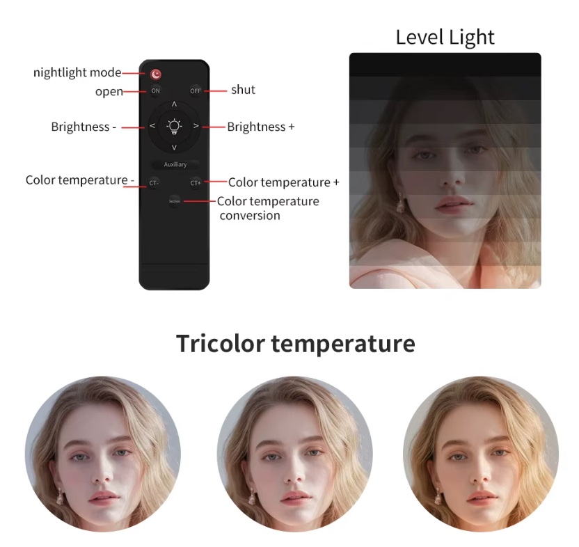 Para interiores e exteriores. Capa exterior elegante com botões de controlo traseiro e ecrã LCD, Não é necessário usar um filtro de cor externa. A temperatura de cor fria e quente e o brilho ajustável em cada modo de luz podem ser controlados com dois botões separadamente. Baixa produção de calor, segurança e proteção ambiental. O tubo macio incluído é flexível, permitindo que o dobre. Ideal para maquilhagem, cabeleireiro, fotografia, vídeo, streaming, etc.. Alimentação à tomada AC 100-240V, Suporte de luz ajustável. Tripé extensível de 60 a 185 centímetros, Pode ser usado com câmaras DSLR e smartphones.